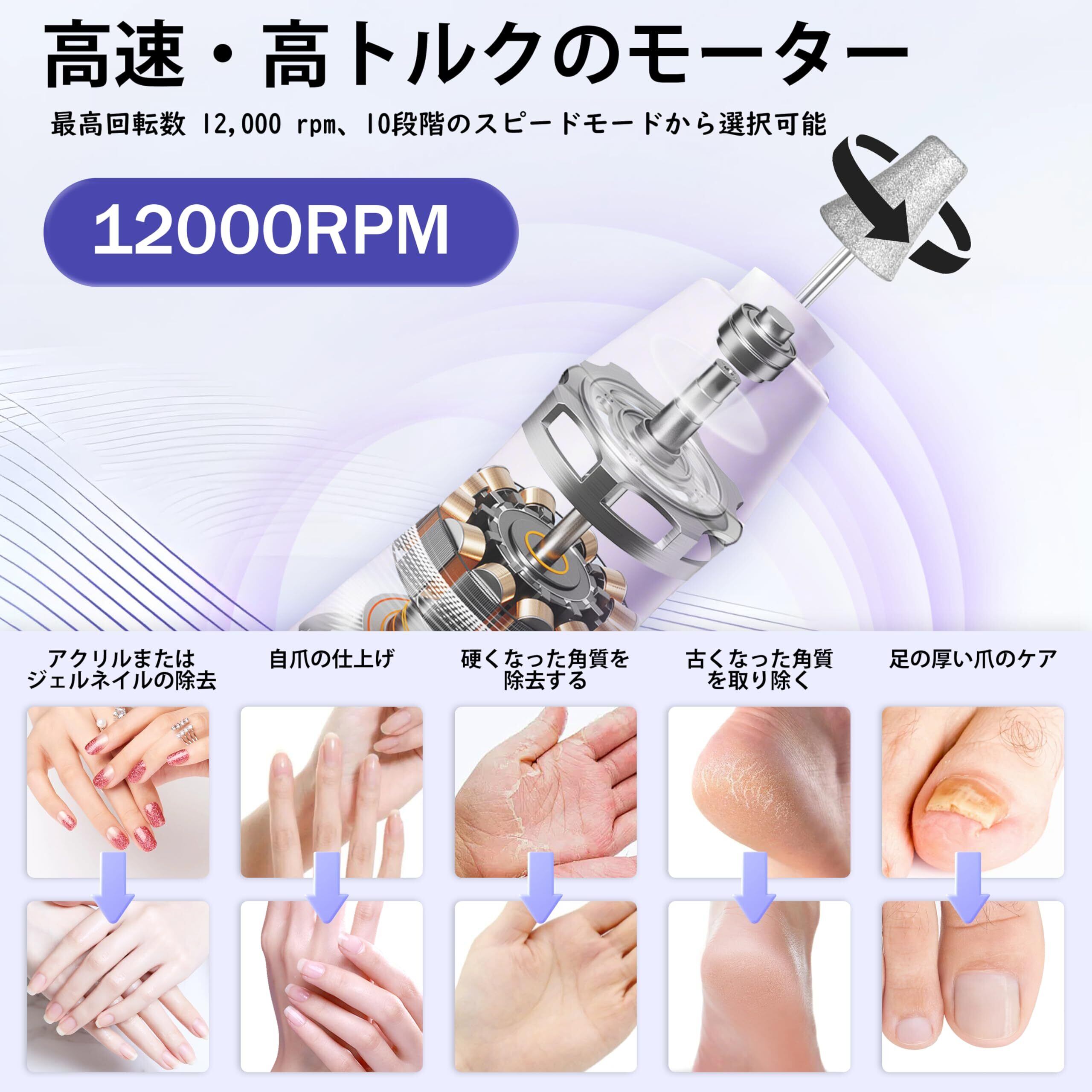 FLORANURTURE ネイルマシン 10個のビット ネイルマシーン ジェルネイル オフ キットネイルケアセット 爪磨き、12000RPM 10段階調整 正逆回転 Type C充電 Light 88g 自宅 (紫)