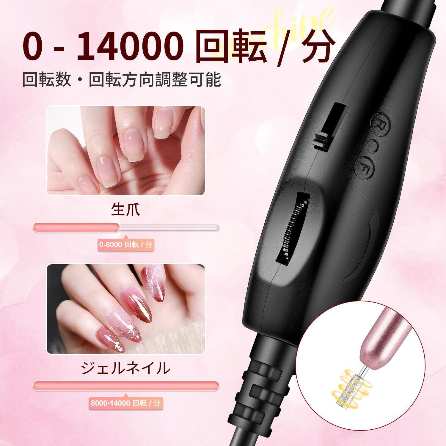 多機能ネイルドリル:調整可能な複数速度と6種類のネイルドリルビットを備え、アクリル、ジェル、ディップパウダーネイルの研磨や除去が可能です。本機は5V/2A DC電源専用です。