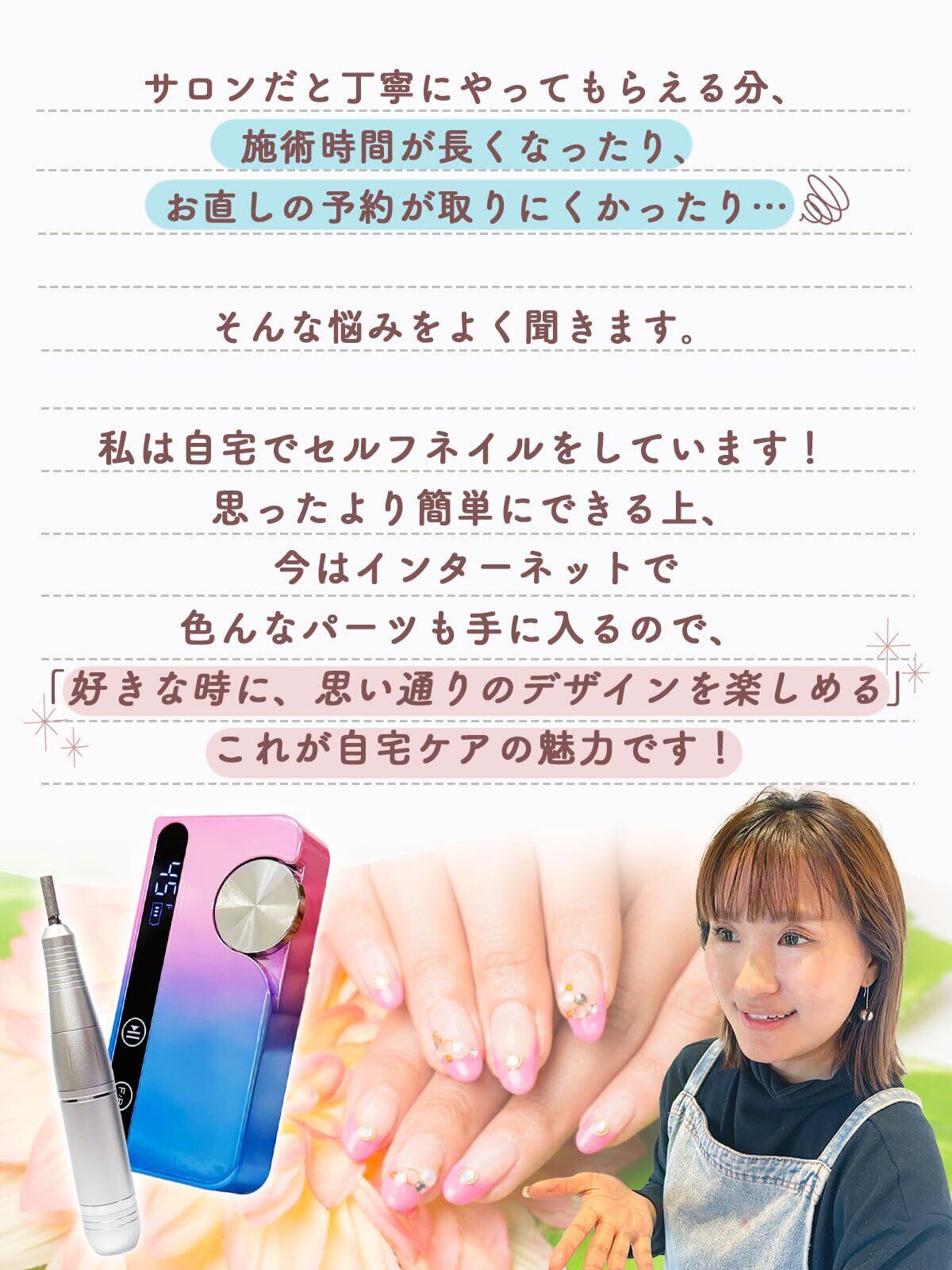 【こんな方におすすめです!】・見た目も性能も妥協したくない方・サロンに行く時間がない方・自宅でネイルオフをしたい方・ネイル初心者で「削りすぎが怖い」と感じている方・甘皮ケアもしたい方