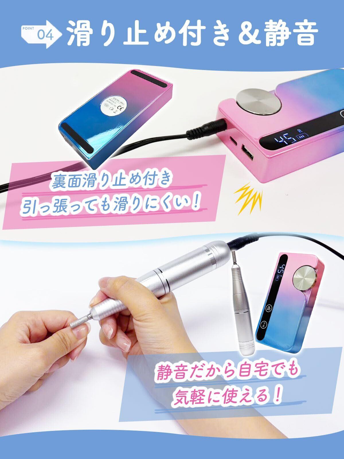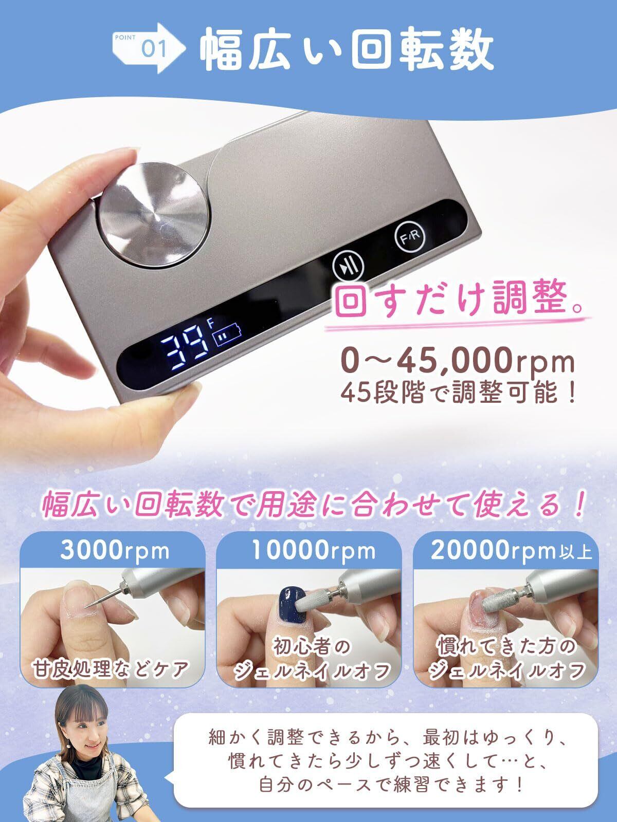 【プロも選ぶ、お手頃ネイルマシン】0〜45,000RPMの高性能モーターを搭載。回転数は45段階で細かく調整ができるので、初心者の方からプロの方まで幅広くご使用いただけます。ブレが少なく、安定した削り心地が特徴です。