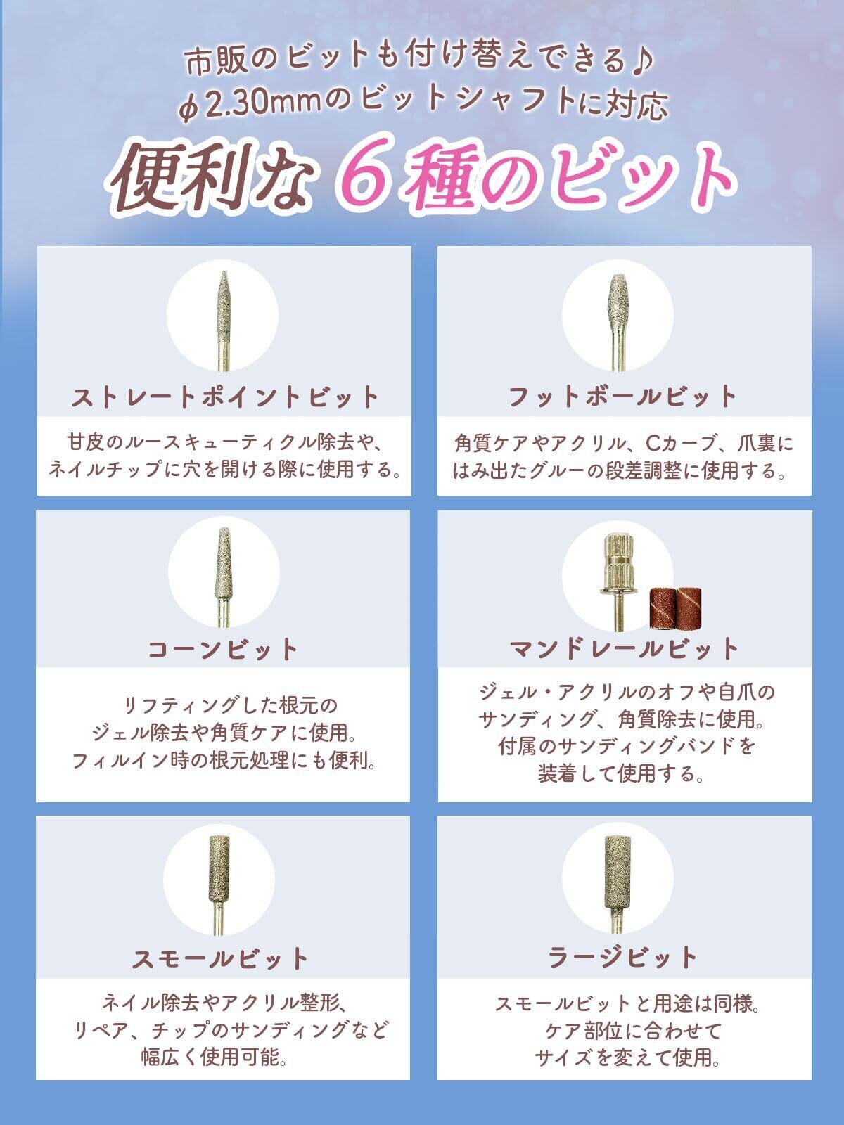 【ジェル、スカルプのオフから甘皮処理まで】ビット6種類、サンディングバンド6種類を付属しています。また、本体にはベルトクリップがついています。