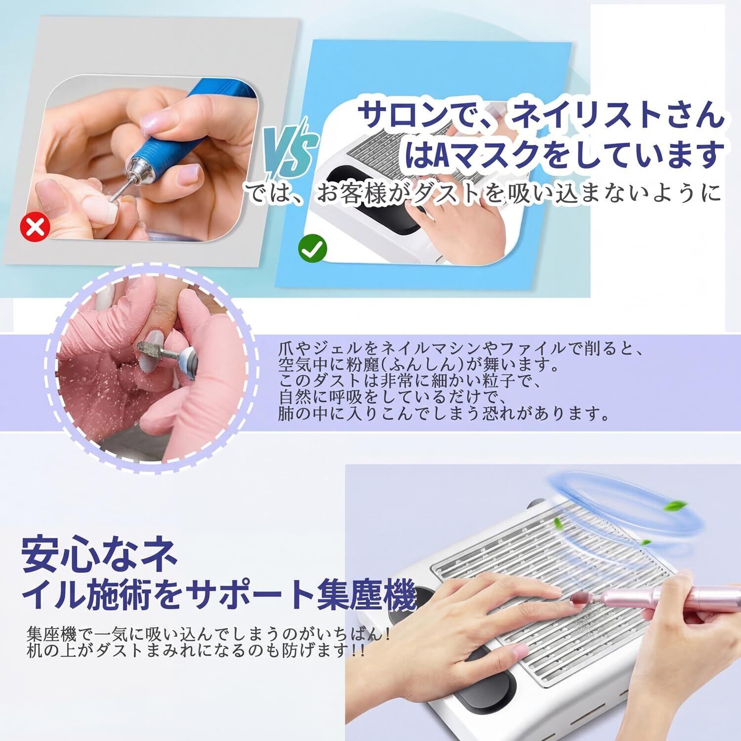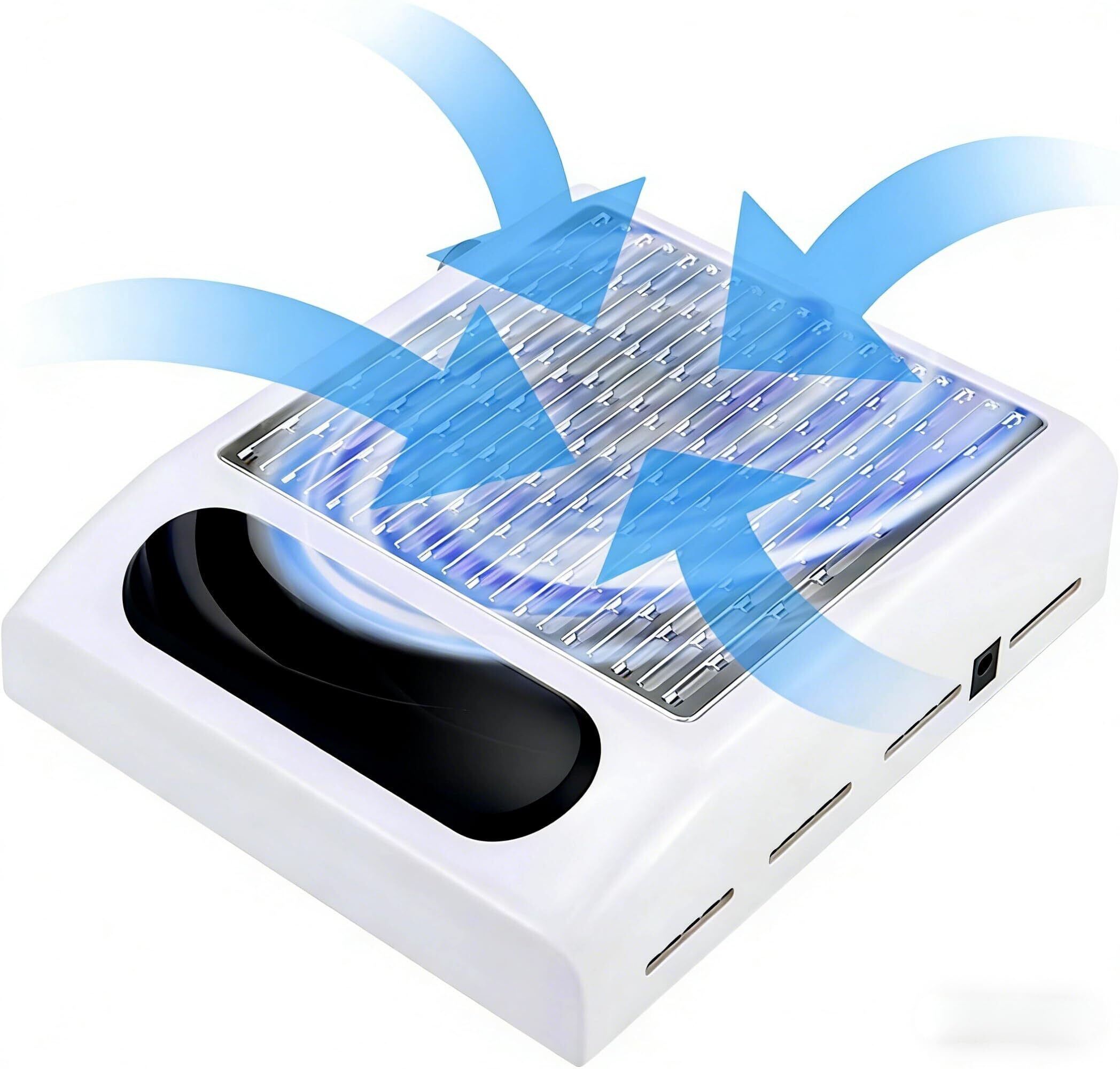 【80Wのハイパワ吸引力ー&広め集塵口】ネイル集塵機が80Wのハイパワー&4500rpmの回転速度で、ダストを徹底的に吸引して舞い散りを防止します。空気中に舞うダストをハイパワーで徹底的に吸引し、処理面積の広いプリーツ構造の特殊引き出しフィルターを採用しており、逆流現象を防ぎ、ダスト漏れの心配もありません。手が置きやすいよう、施術中もストレスを感じにくいで、本体の上に手を載せて使うので、視界を遮らないのもメリット。また、集塵口の面積が広いので、一度にたくさんのダスト吸引ができる。ネイルダストコレクターの 底面にはヒートシンクの穴があり、連続作業でも本体が熱くなりませんので、使用時間が長くても安心。モーターの寿命が約10,000時間!放熱性と耐久性が抜群です。