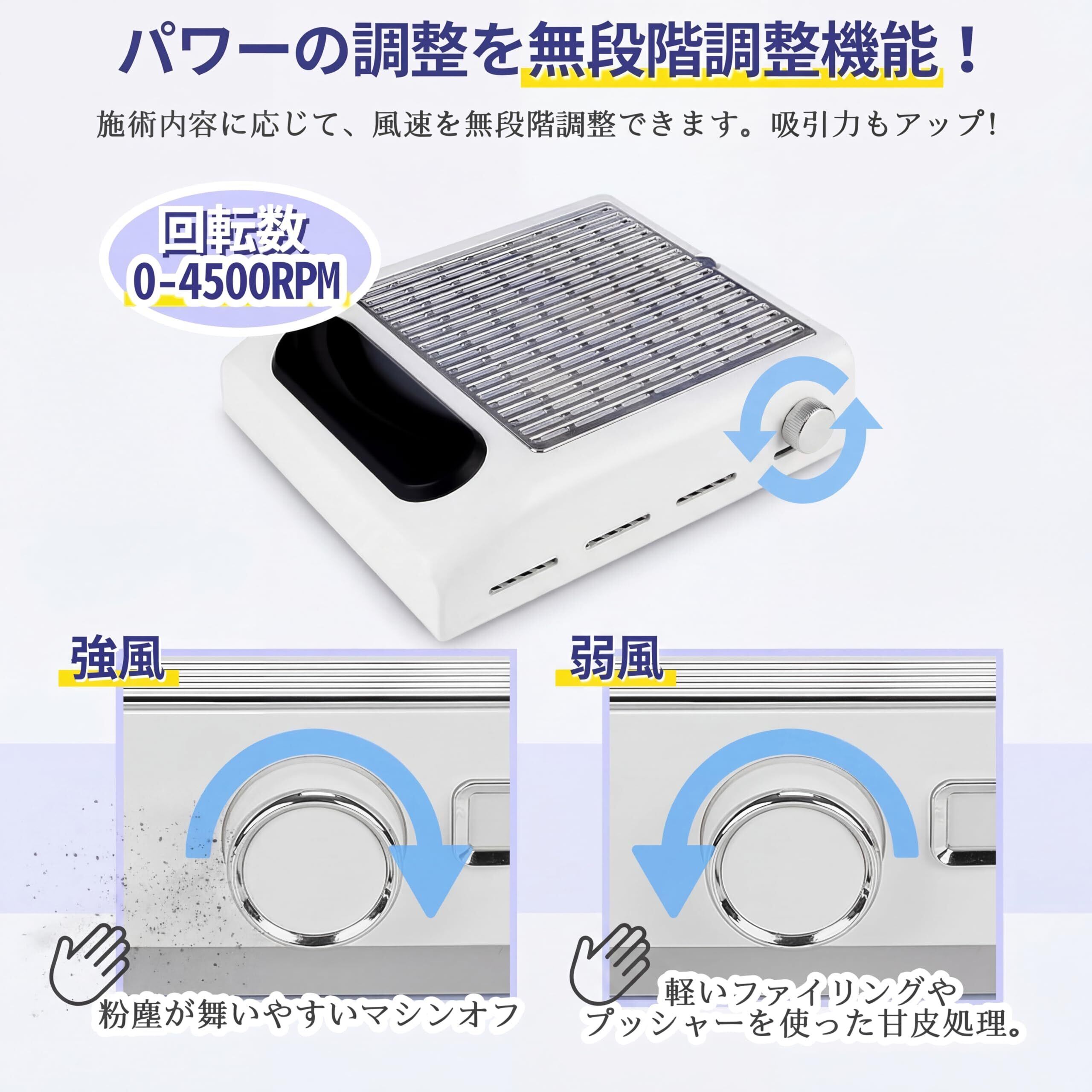 【パワーを無段階調節&弱風ー強風】弊社集塵機ネイルダストコレクターが普通のよりも便利、従来のワンタッチスイッチから無段階調整可能なロータリースイッチを改良し、1500-4500rmb回転力無段階調整可能なことから、施術内容に応じて調節したい人には、風力とパワーを調整することが可能です。粉塵が舞いやすいマシンオフには強風を、軽いファイリングやプッシャーを使った甘皮処理には弱風を、といった具合に使い分けできますよ。