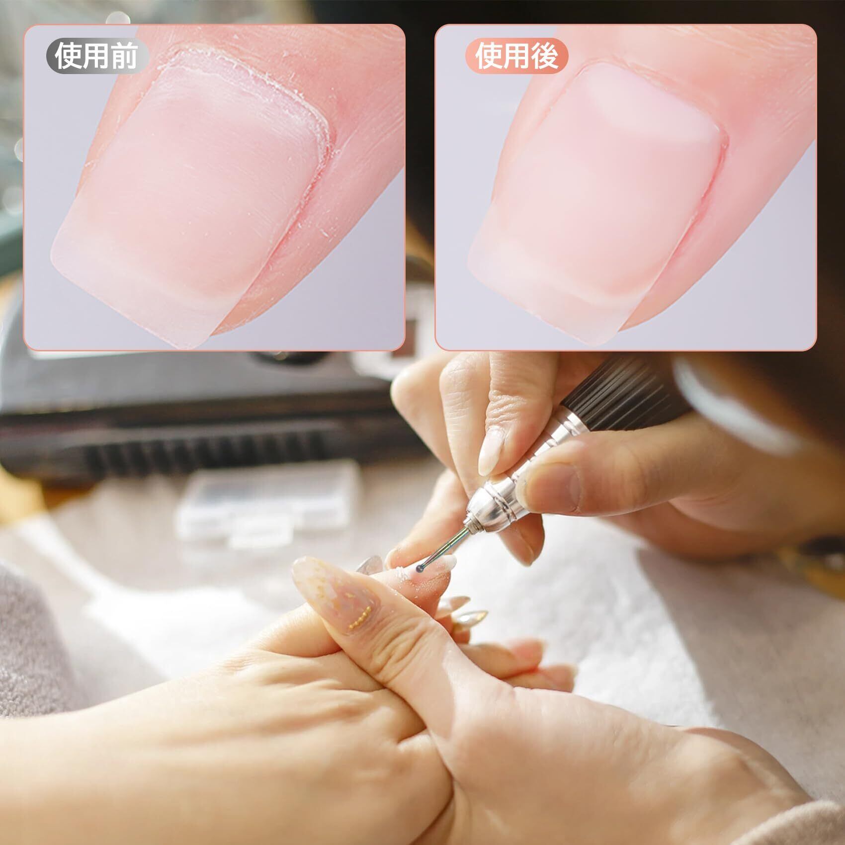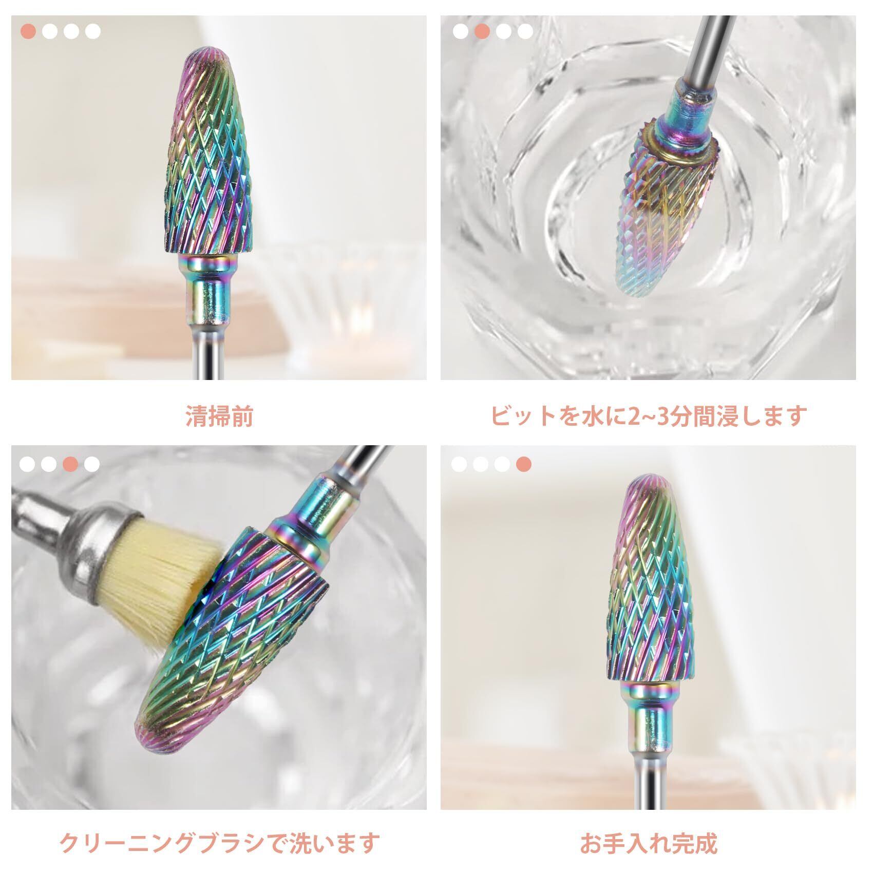 ネイルケアビットの使用感について:高硬度ビットのため、回転数や当て方により使用感は異なります。初めての方は低速からの使用をおすすめします。セルフネイルや練習用として取り入れやすいネイルケアビットです