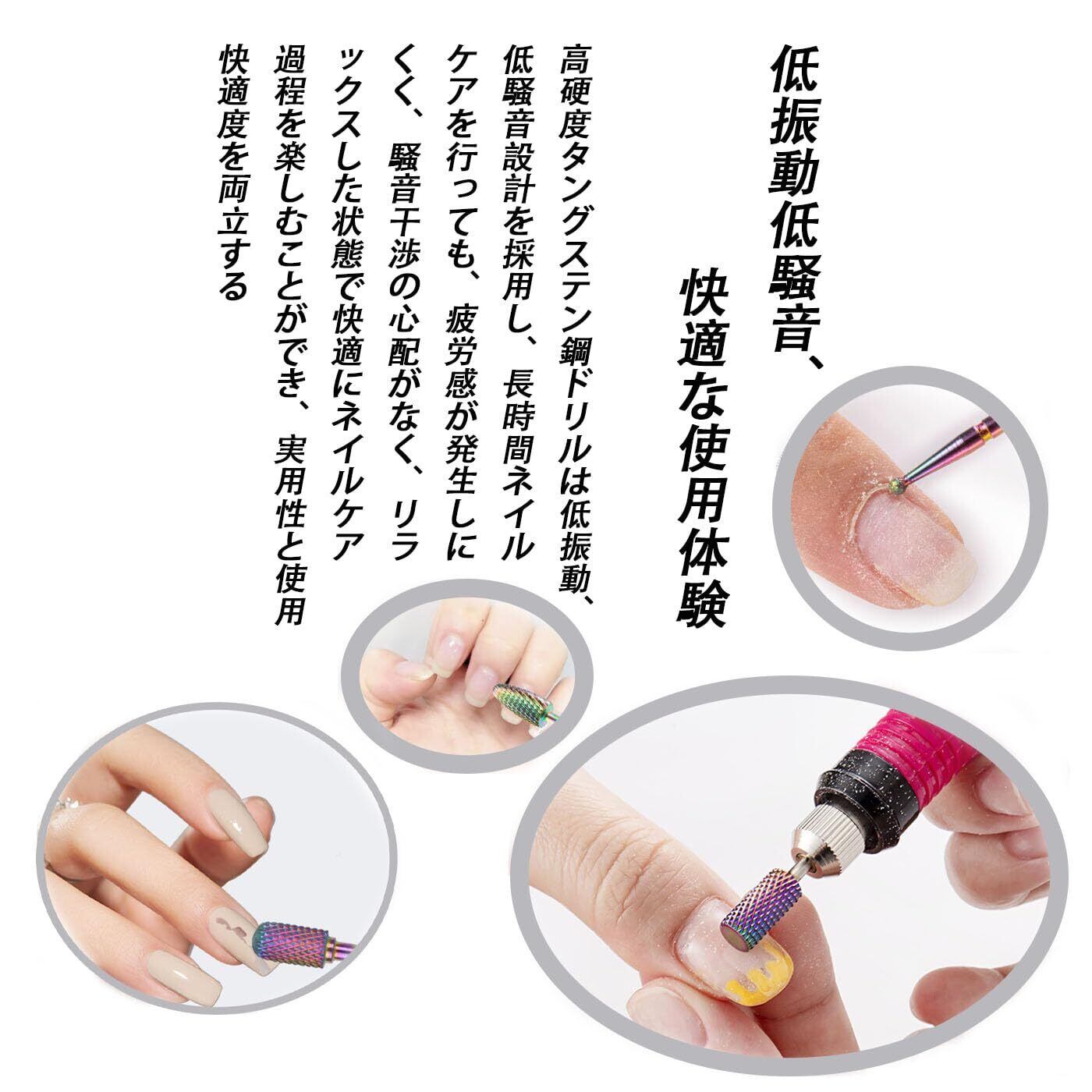 低振動低騒音、快適な使用体験:高硬度タングステン鋼ドリルは低振動、低騒音設計を採用し、長時間ネイルケアを行っても、感が発生しにくく、騒音干渉の心配がなく、リラックスした状態で快適にネイルケア過程を楽しむことができ、実用性と使用快適度を両立する