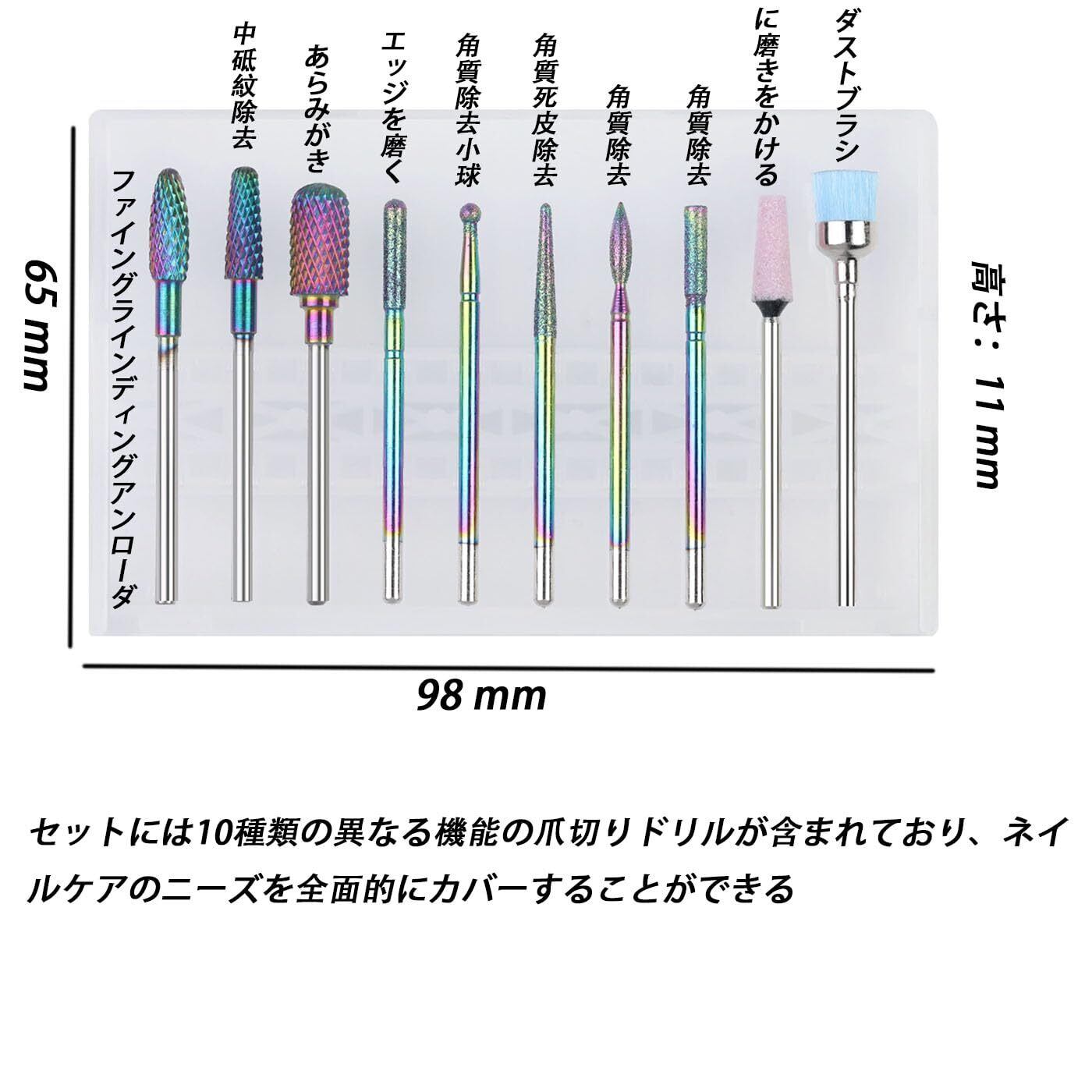 10種類のドリルの組み合わせ、多機能ネイルケア:セットには10種類の異なる機能の爪切りドリルが含まれており、ネイルケアのニーズを全面的にカバーすることができる——甘皮処理、爪の側面修正、またはネイルケア、研磨研磨研磨、爪の表面ケアから縁の手入れまで簡単に対応でき、プロのネイリストも初心者も使用でき、自宅でサロン級のネイルケアの完成効果を楽しむことができる
