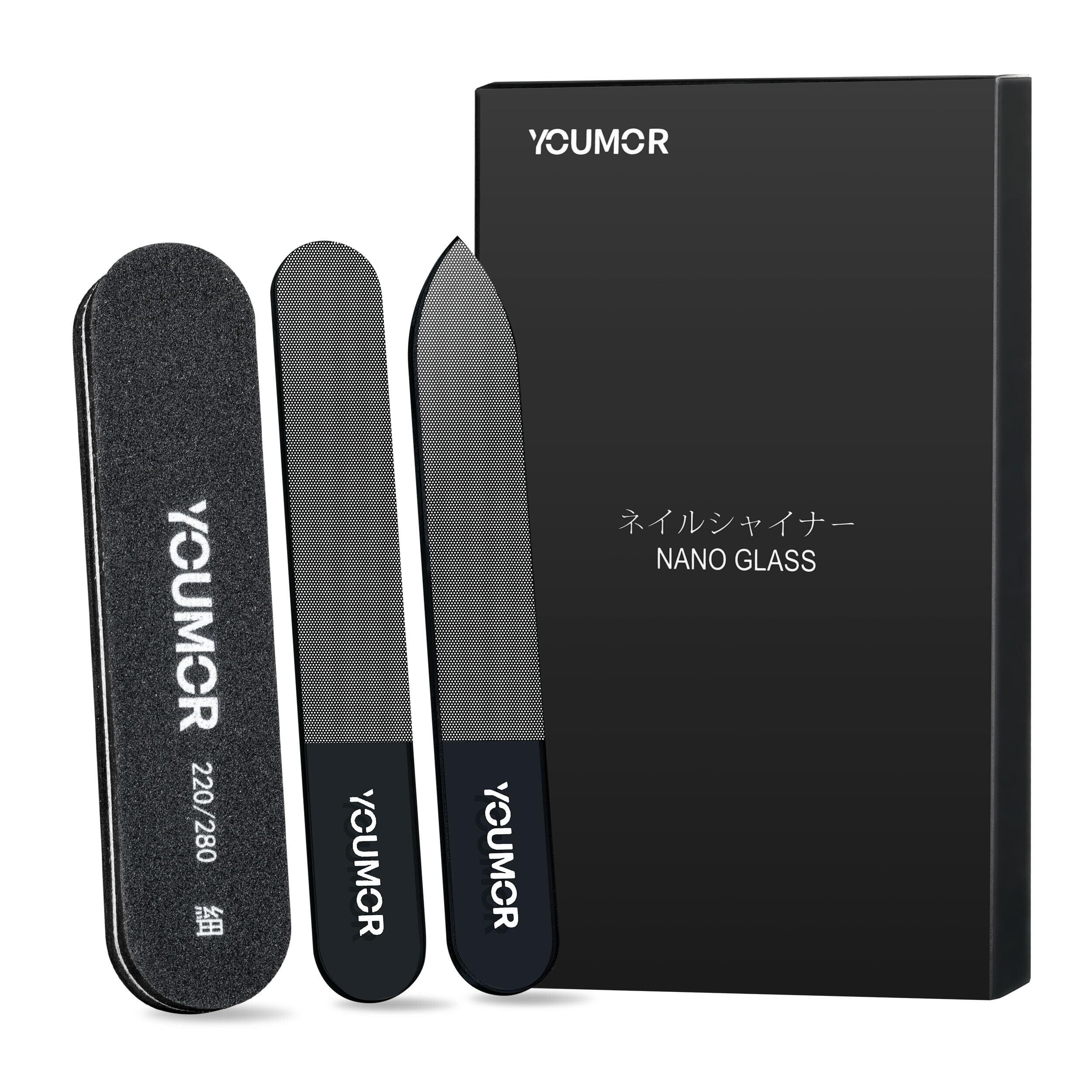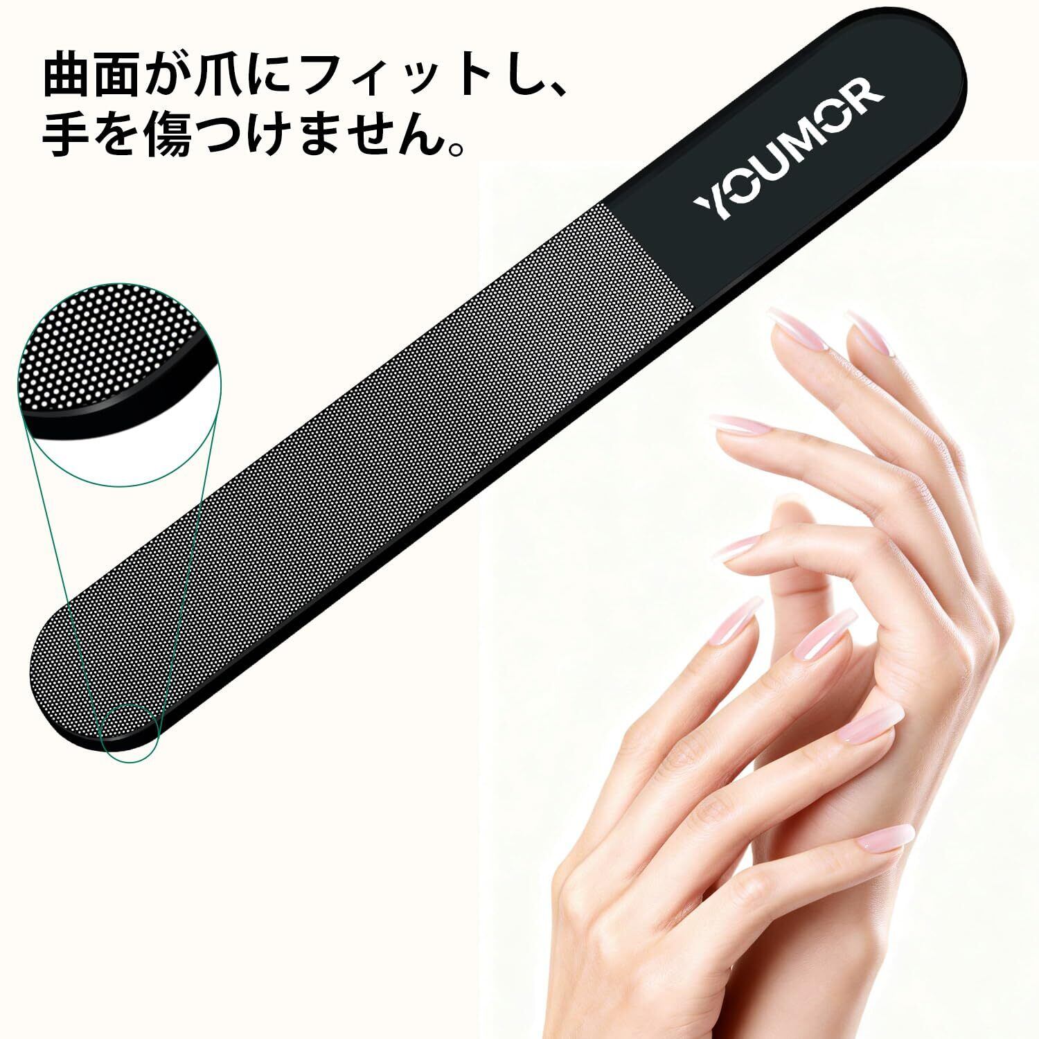 YOUMOR 爪やすり 爪磨き ガラスネイルシャイナー 3本セット つめみがき つめやすり ネイルケアセット ピカピカ 艶出し (仕上がりが変わる下処理スポンジ付)ブラック