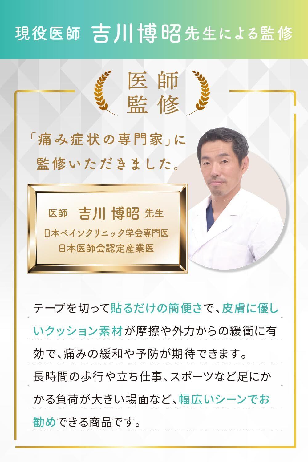 【現役医師監修の肌に優しい設計】 現役整形外科医 吉川博昭先生による監修。美しくキレイで健康的な足を保てるよう、痛みの専門医と共同開発する事によって誕生しました。 靴擦れなどの足のトラブルは、水ぶくれや出血を伴い症状が長期化する恐れがあります。また、症状が改善したとしても、色素沈着などが生じる可能性も。。肌がかぶれにくい素材を使用して、『皮膚への優しさ』と『痛みの緩和』にこだわった製品です。