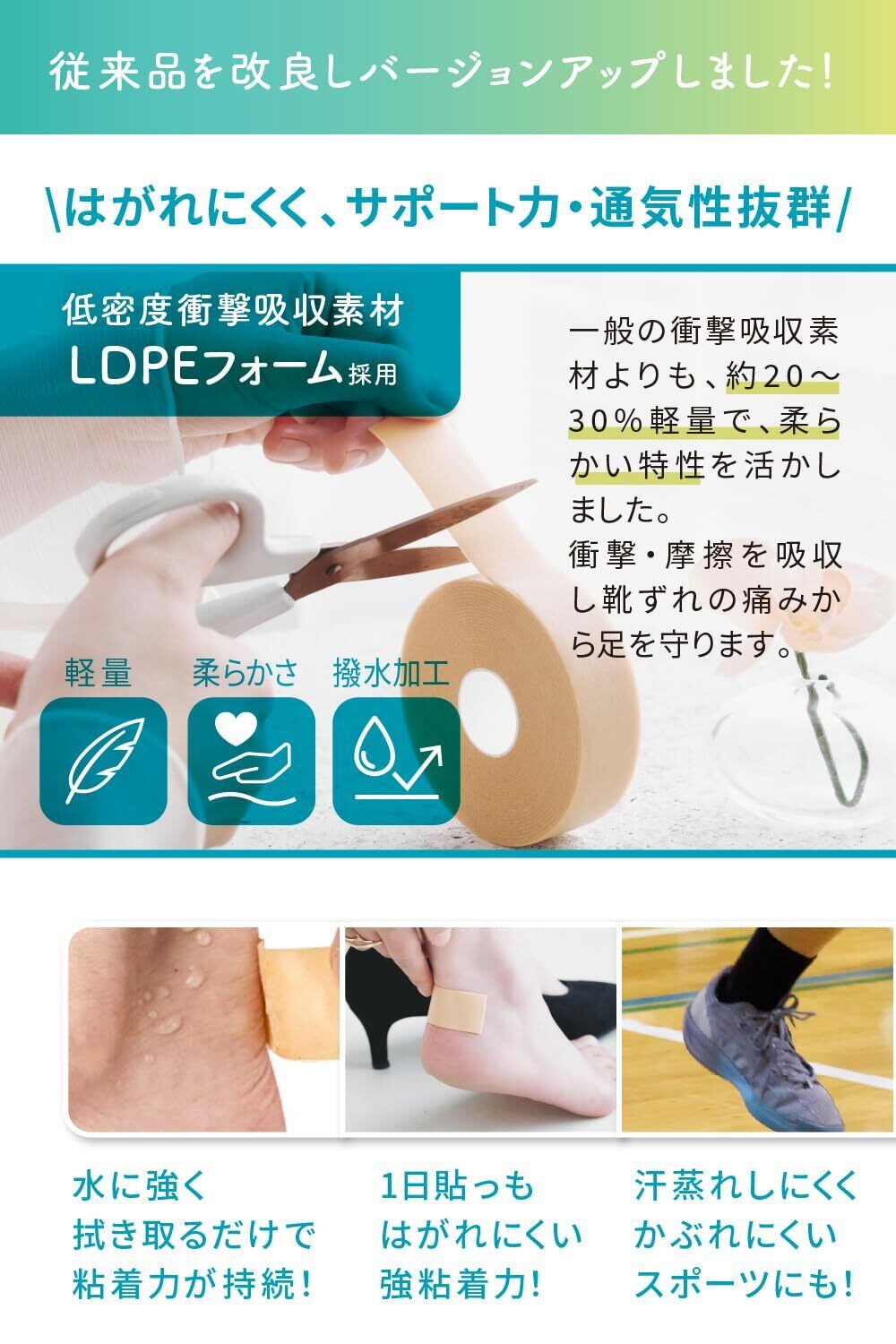 【汗・蒸れに強い防水タイプ】 蒸れやすい足元に配慮した、汗に強い防水仕様です。革靴・合皮・ゴム素材・ビニール素材などの靴をご使用の場合でも、汗蒸れしにくい靴擦れ防止テープです。さらに強力な防水加工で、雨などの水分も弾きます。季節、天候を気にせずに、通年お使いいただけます。