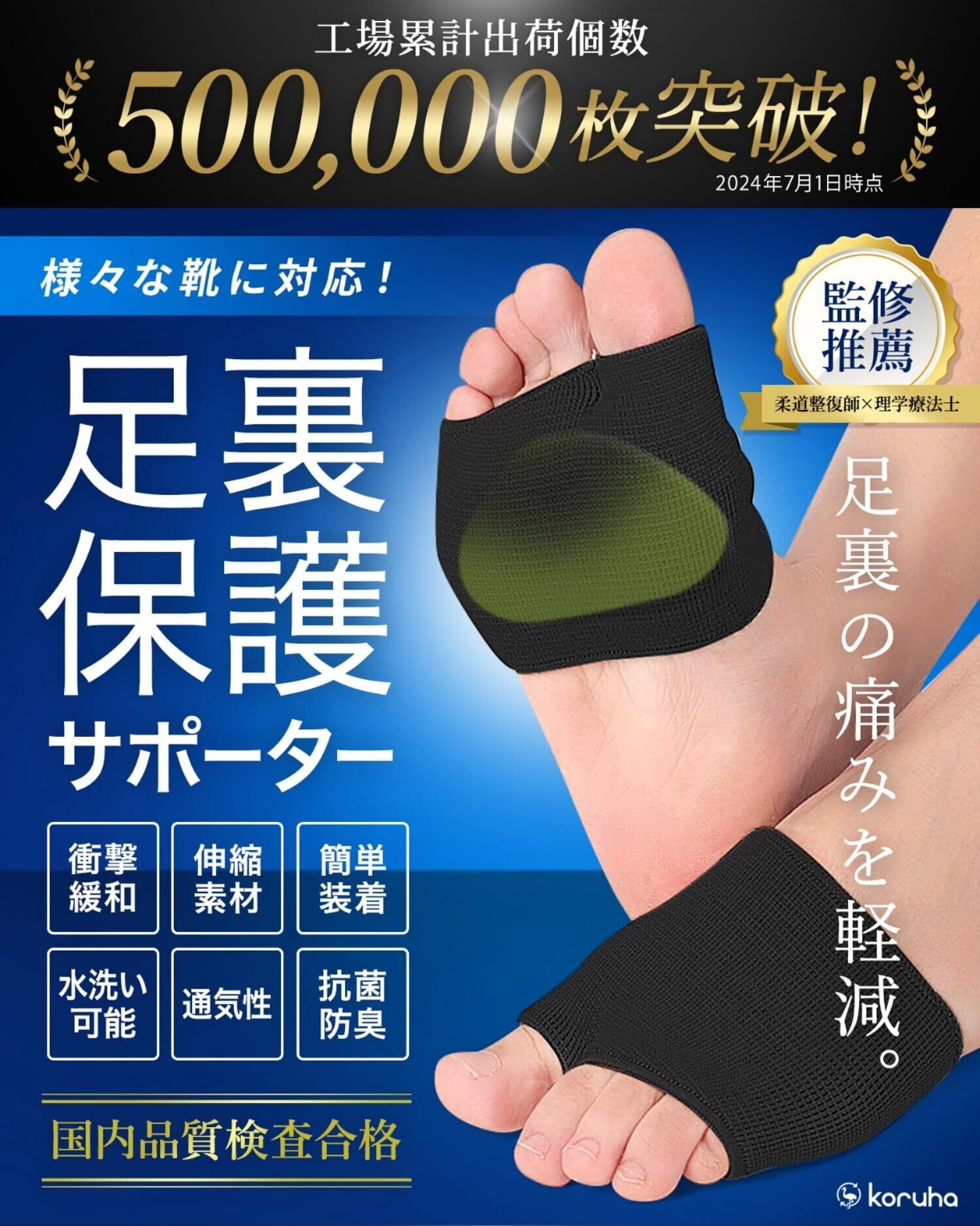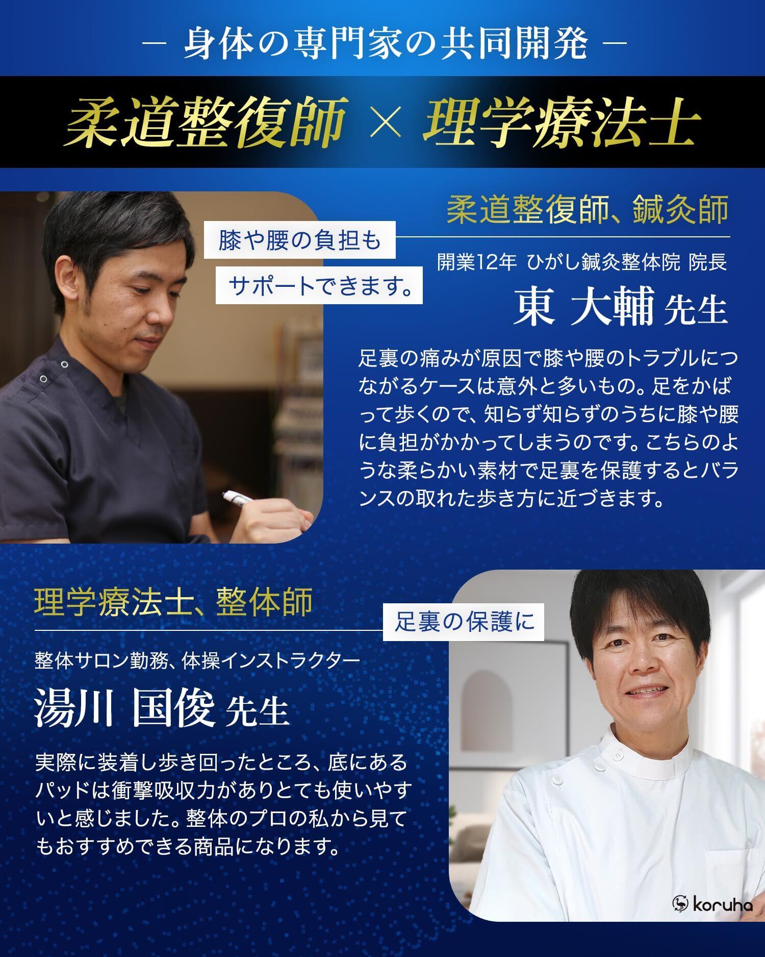 ️ご購入前に必ずお読みください▷※長距離移動や激しい運動時にはどうしても脱げてくる場合がございます、ご了承ください。(あくまで足裏を保護するパッドになります)。️サイズが合わなかった場合は当店に直接ご連絡ください。(※交換対応可能です) 【柔道整復師×理学療法士監修・推薦!】 柔道整復師・ひがし鍼灸整体院院長の東大輔先生と、理学療法士・整体師として活躍されている湯川国俊先生と共同開発したサポーターです。「当製品は膝や腰の負担もサポートできるので、足裏の負担軽減に加え、バランスの取れた歩き方にも近づく事ができます」(東大輔先生)「実際に装着し1日過ごしてみたところ、快適な歩行を実感。足裏だけでなく足の付け根への負担も軽減されていると感じました。」(湯川国俊先生)
