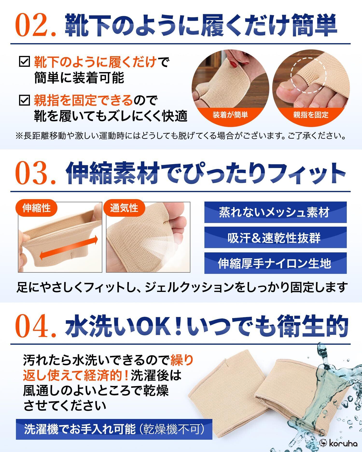 【伸縮素材でぴったりフィット】 伸縮性のある厚手ナイロン生地を使用しているので、足にやさしくフィットしジェルクッションを正しい位置に留まらすことができます。蒸れないメッシュ素材は通気性があり、吸汗&速乾性も抜群!パンプスなどは裸足で履くよりも、サポーターを着用している方がサラッと快適です。年中お使いいただけます。