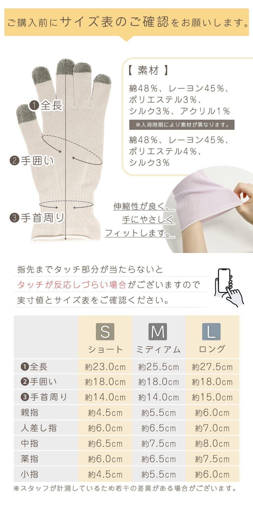 【3サイズ×5カラー展開!手のサイズや指の長さに合わせて選べる快適フィット】小さな手の方や子ども向けにはショートサイズ、指が長めの方にはロングサイズを推奨。標準サイズを含めた3サイズ展開で、ご家族やカップル、親子でもペア使いが可能。カラーバリエーションはライトグレー、アジサイ、ラベンダー、ベージュ、アイボリーのくすみ系おしゃれカラー。肌なじみがよく、インテリアに馴染む上品な色合いは就寝時も気分を上げてくれます。サイズ選びで失敗しにくく、フィット感も抜群。リピート購入・プレゼント用にも選ばれています。手袋 レディース メンズ 子供用 ショート ロング サイズ展開 豊富 スマホ対応 就寝用 グローブ おしゃれ カラフル