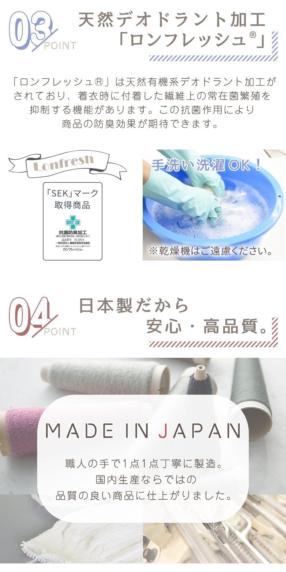 【抗菌防臭&洗濯OKで衛生的に使える!毎日のケアを清潔に】天然デオドラント加工「ロンフレッシュ」が施されており、抗菌・防臭性能が長持ち。SEK認証取得の安心素材で、汗や菌の繁殖を抑えて清潔に使えます。ハンドクリームを塗った上から使用してもOKで、肌に密着しないサラリとした着用感が魅力。手洗い可能なので、繰り返し洗っても品質を保ち、毎日衛生的に使えるのも嬉しいポイント。乾燥肌・敏感肌の方にも優しく、アルコール除菌後の荒れた手の保護にもおすすめ。手汗対策・ニオイ対策・手荒れ対策を同時に叶える優れもの。抗菌手袋/防臭グローブ/洗えるナイト手袋/ロンフレッシュ加工/SEK取得手袋/おやすみ用手袋 清潔