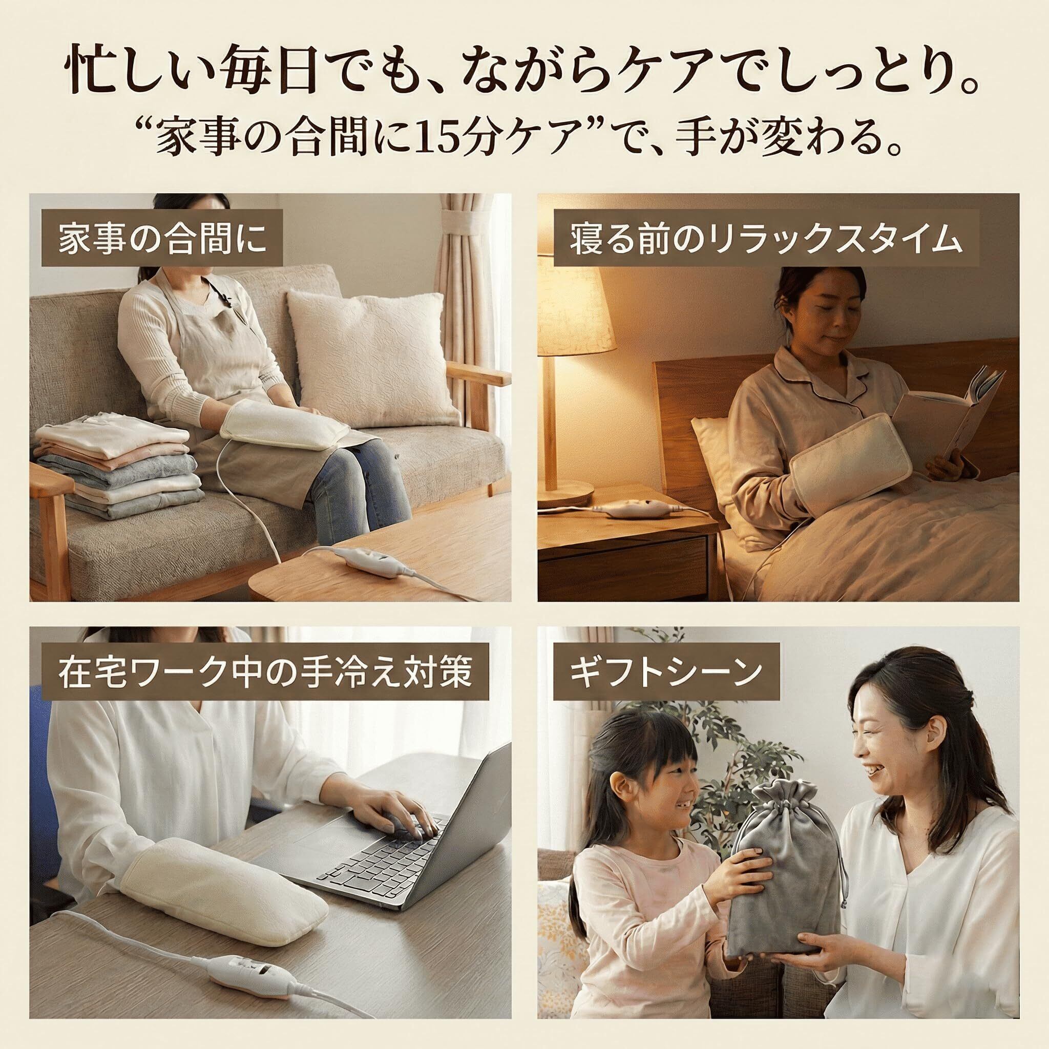 忙しい毎日でも「ながらケア」でしっとり 家事の合間や、寝る前のリラックスタイム、在宅ワーク中の冷え対策にも最適。 手袋のようにサッとはめるだけのシンプル設計で、手間を感じさせません。