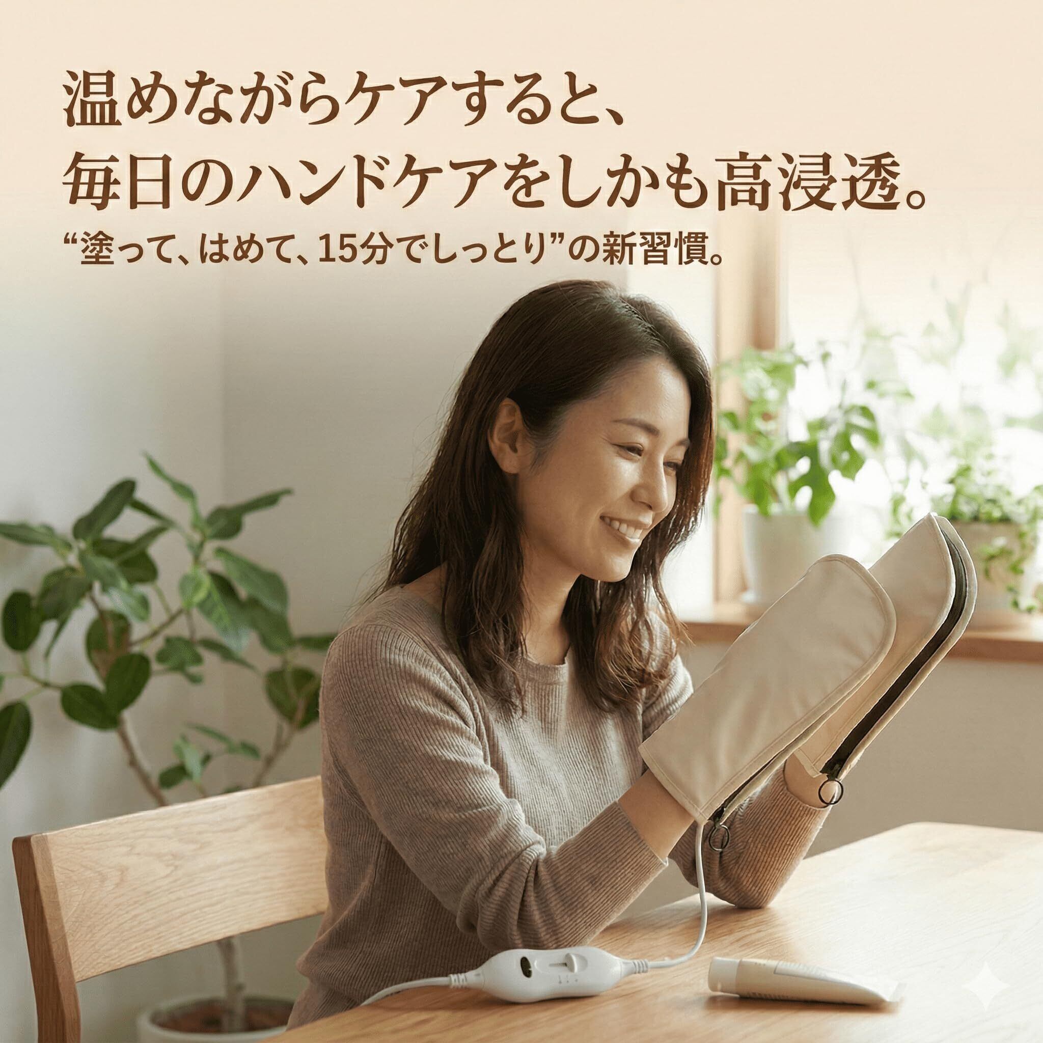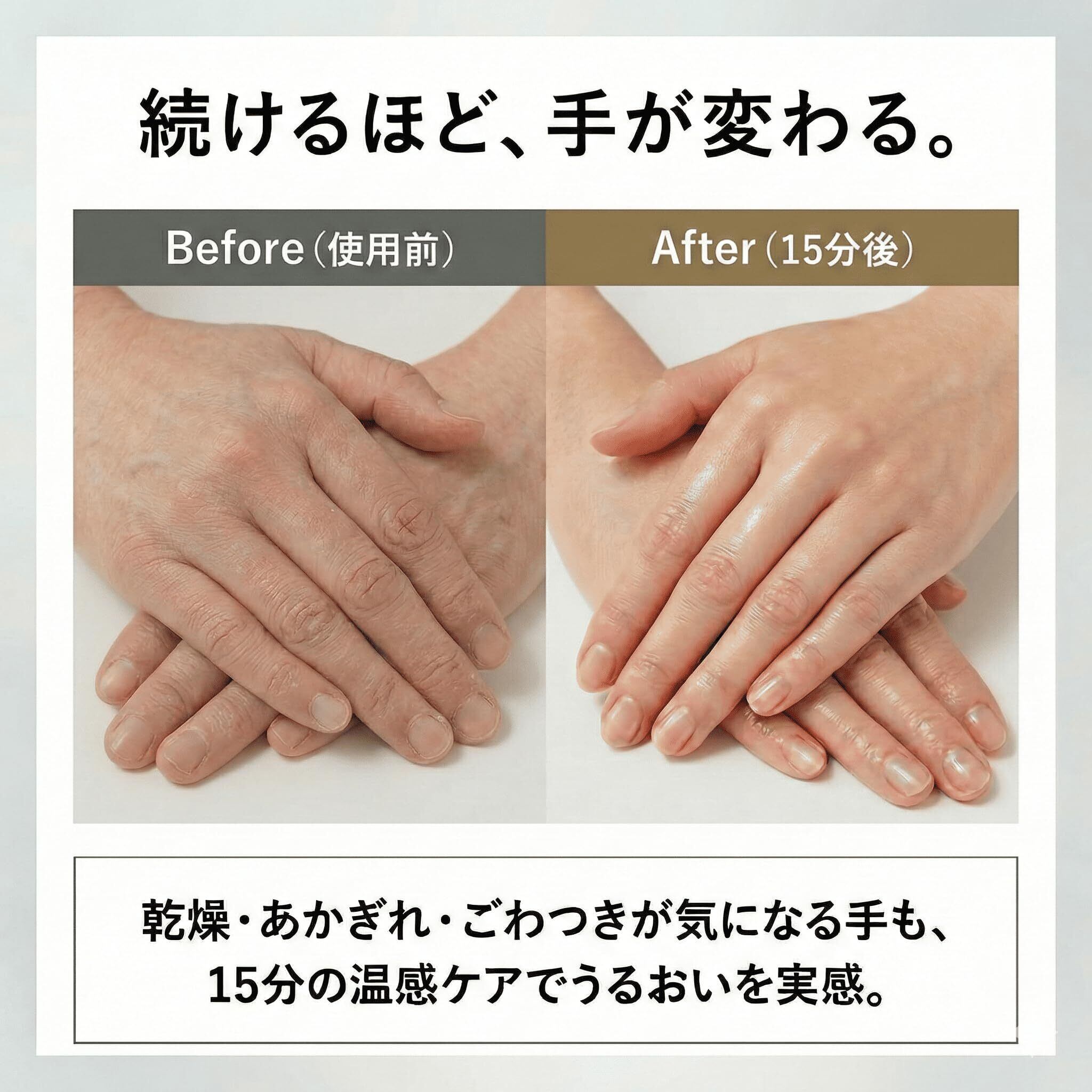 コンセント式でよりパワフルに、もっと心地よく。 日々の家事やデスクワークで疲れ、乾燥やあかぎれが気になるその手に。 「塗って、はめて、15分」の温感ケアで、手肌の奥(角質層)までしっとり潤いを届けます。