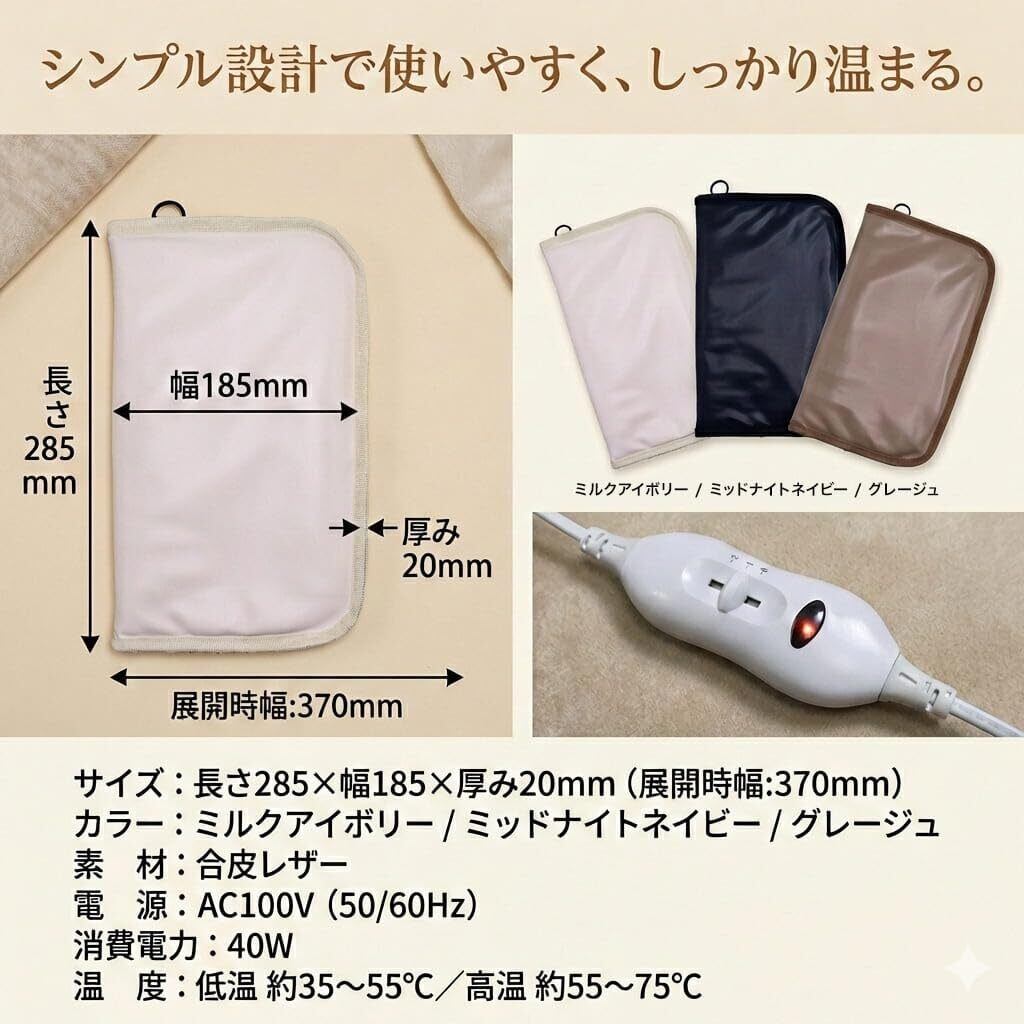 商品仕様 サイズ:長さ 285×幅185×厚み20mm(展開時幅:370mm) カラー:ミルクアイボリー / ミッドナイトネイビー / グレージュ 素材:合皮レザー 温度:低温 約 35~55°C / 高温:約 55~75°C