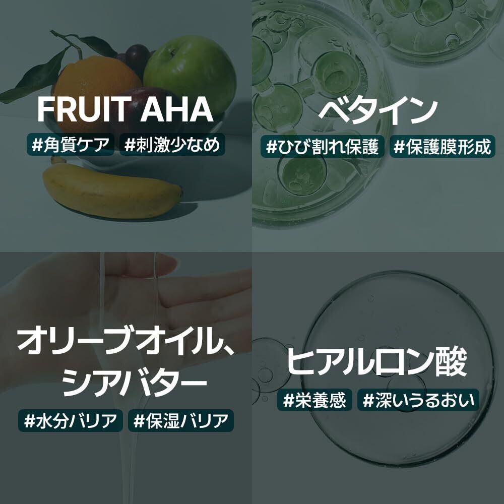 【簡単オールインワンフットケア】 角質ケア:FRUIT AHAで白く浮いた角質をケア 鎮静:ひび割れた部分をベタインでやさしく鎮静 保湿:オリーブオイル・シアバターでしっかり保湿 栄養補給:ヒアルロン酸で豊富な栄養を補給