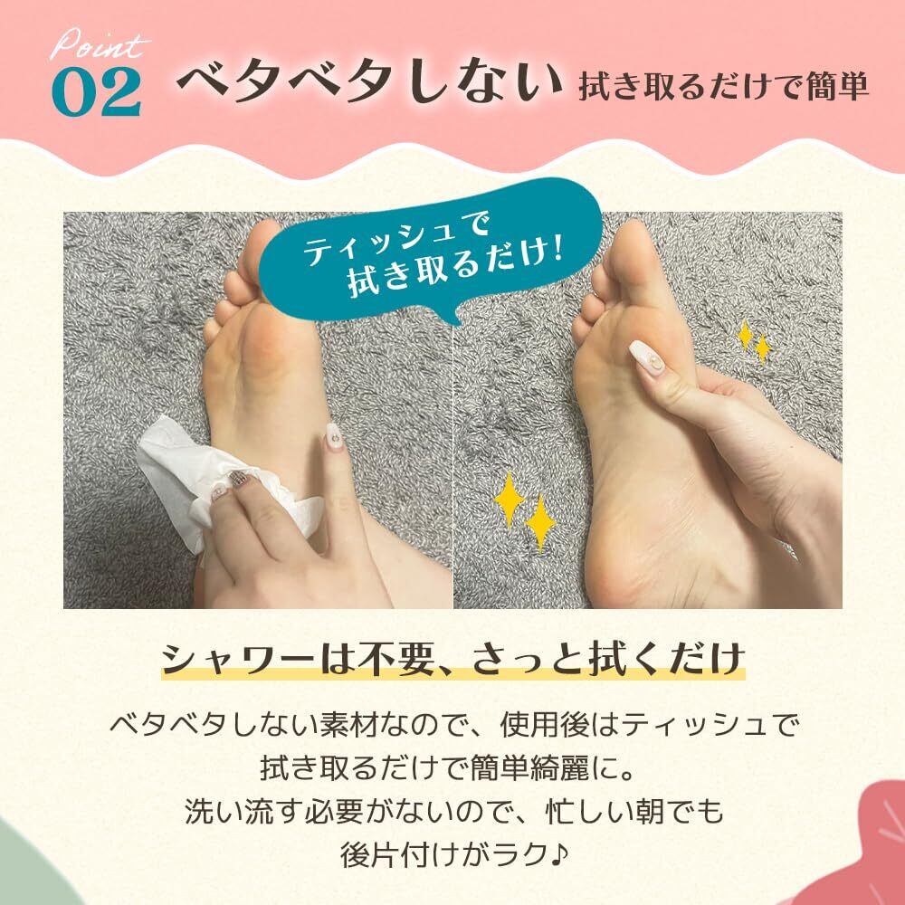 【使用後は拭き取るだけ】樹液シートは足がベタベタしそう...と不安に思っているあなたにおすすめです。使用後はシートがベタベタしないタイプなのでティッシュで拭き取るだけで簡単キレイに。足を洗い流す必要がなく、後片付けがとっても楽です。