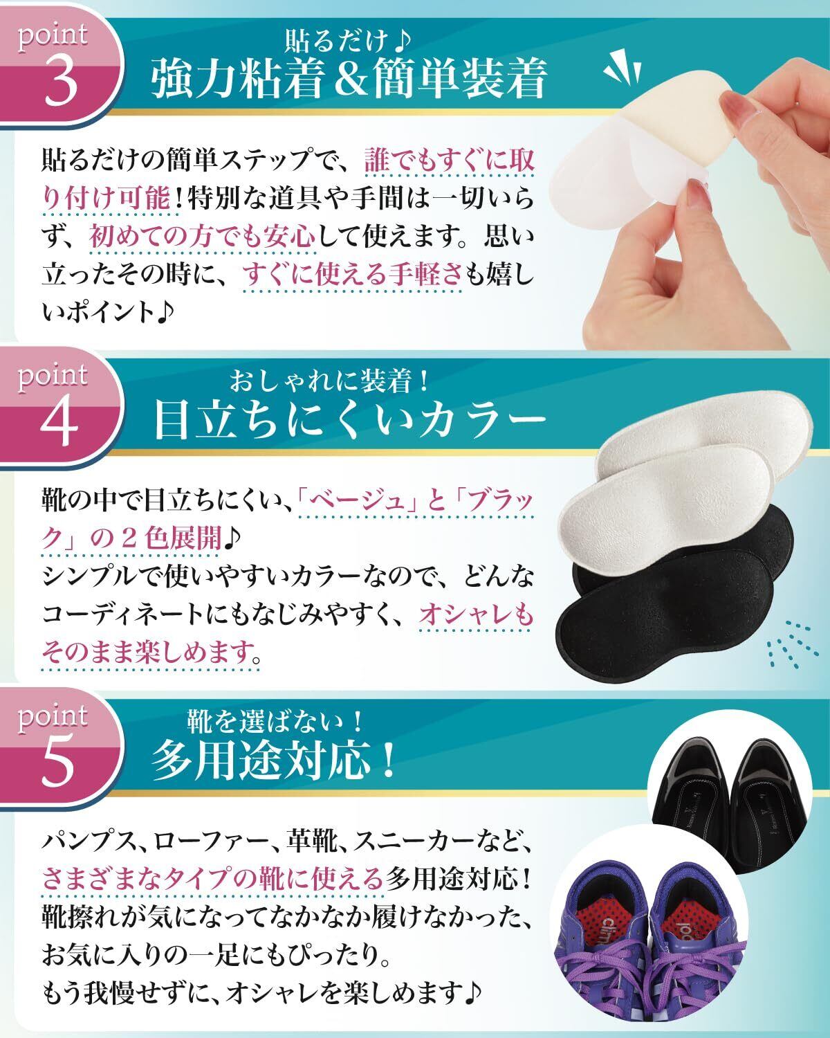 【貼るだけ簡単】特別な道具や手間は一切いらず、すぐ使える手軽さも嬉しいポイントベージュ・ブラックの2色展開、どんな靴にもなじみやすくオシャレもそのまま楽しめます。