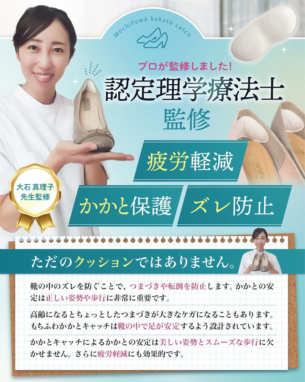 【認定理学療法士監修】歩きやすさと美姿勢をサポートする「もちふわ かかとキャッチ」作業療法士・脳卒中認定理学療法士・呼吸療法認定士などの複数の専門資格を持つ大石真理子先生が監修。
