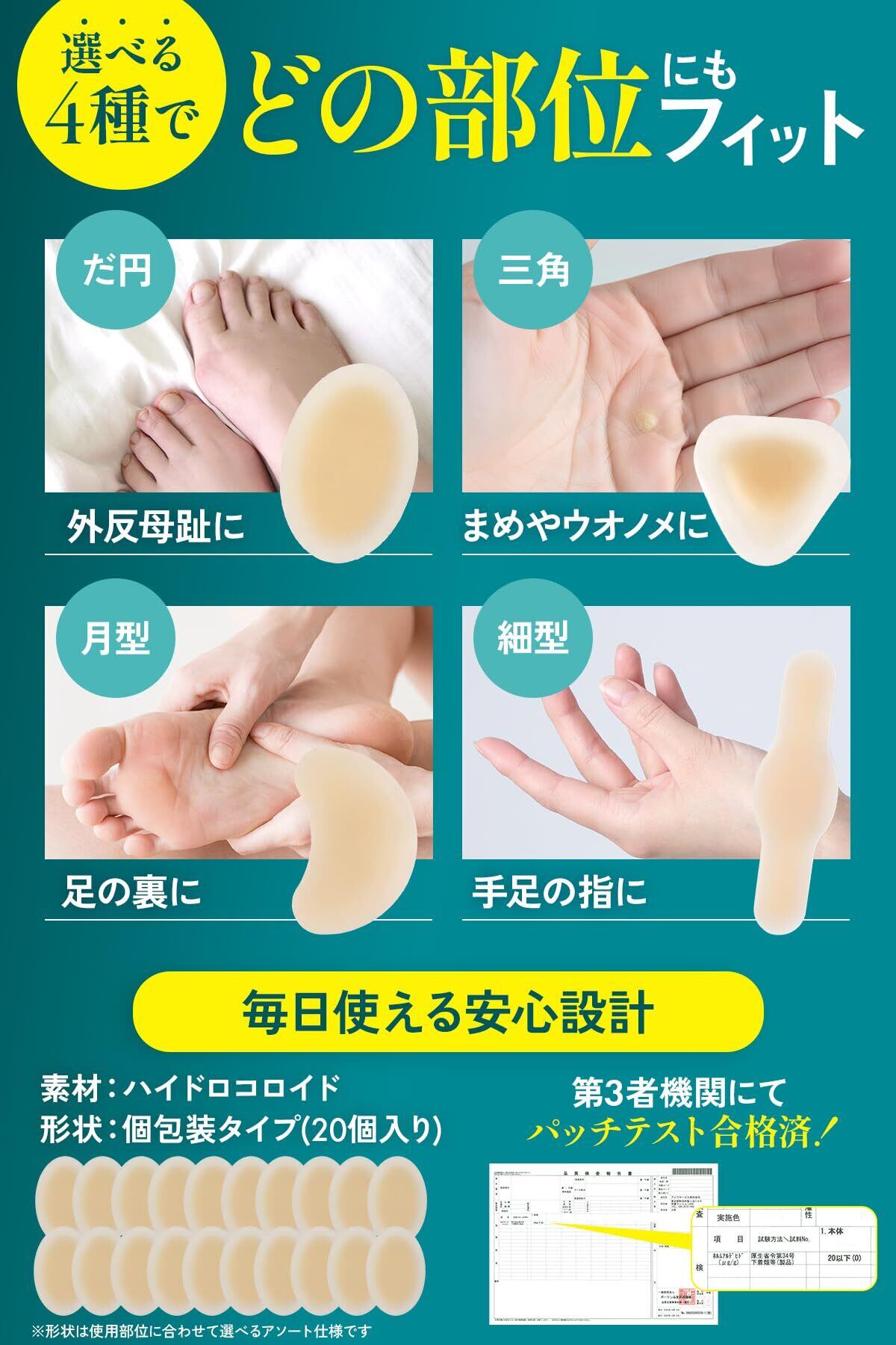 【4種形状・全部位対応】 だ円・三角・月型・細型の4バリエーション展開で、あらゆる足の形状にフィット。靴擦れ防止はもちろん、自分に合う形が見つかりにくかった「指の間」や「かかと」まで幅広くカバー。部位ごとに最適な形状を選べるため隙間なく密着し、従来のポイント保護では届かなかった箇所の違和感も、貼った瞬間から物理的にガードします。