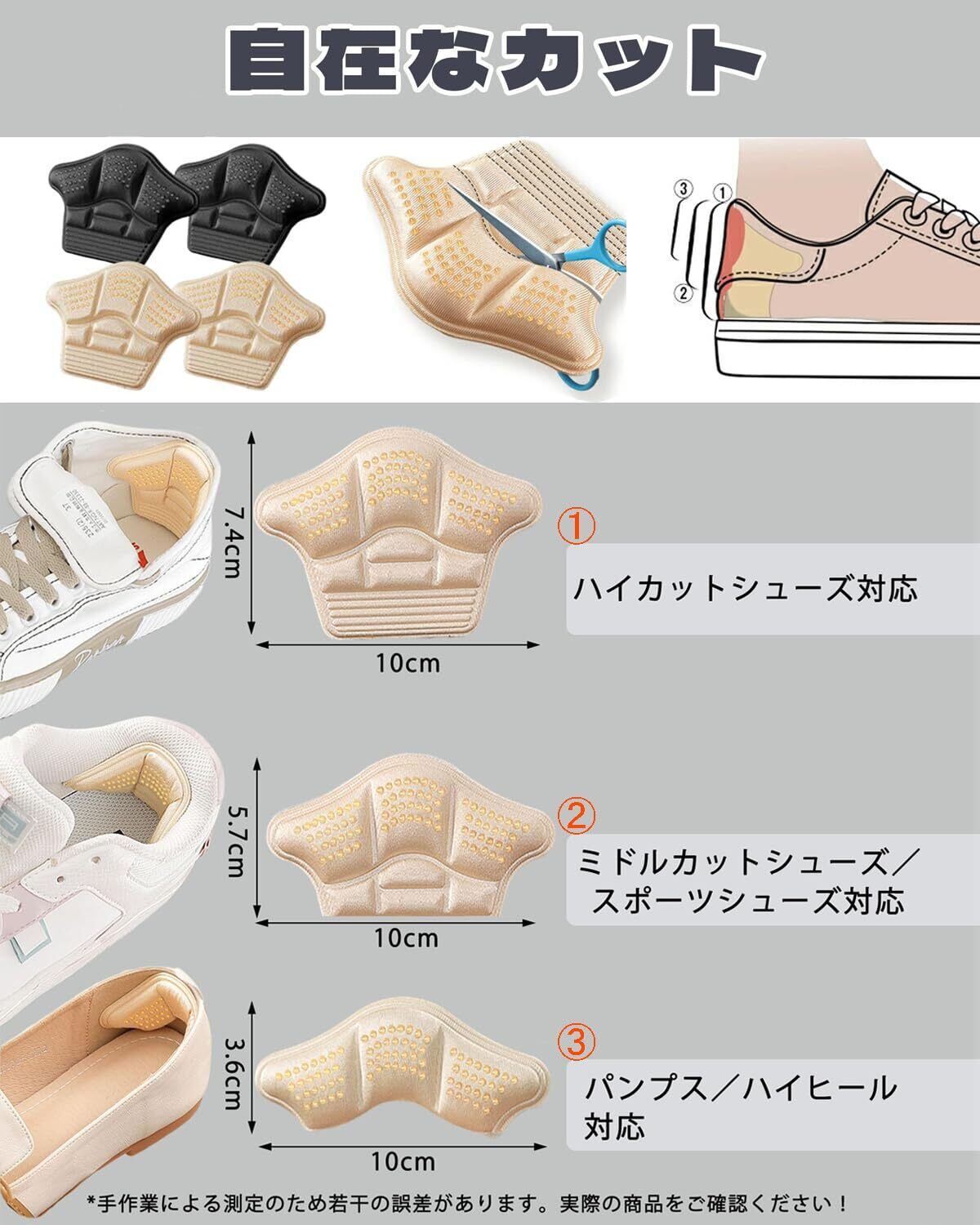 【裁断可能・貼るだけ簡単・使いやすい】サイズを自由に裁断でき、かかとにくっつく心配が全くありません。ご自身のサイズに合わせてカットすることもできます。取り付けはかかとパッド裏面の粘着保護シートを剥がして靴のかかと部分に貼り付けるだけ。簡単に装着できます。靴擦れ防止パットを活用すれば、いつでも快適にお出かけを楽しめます。