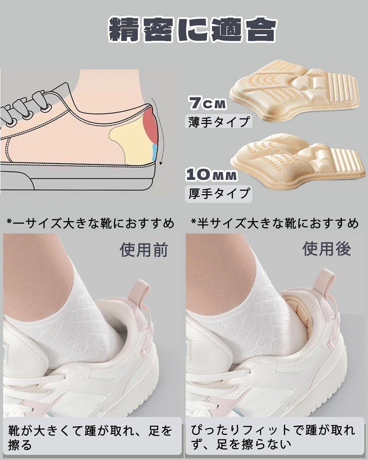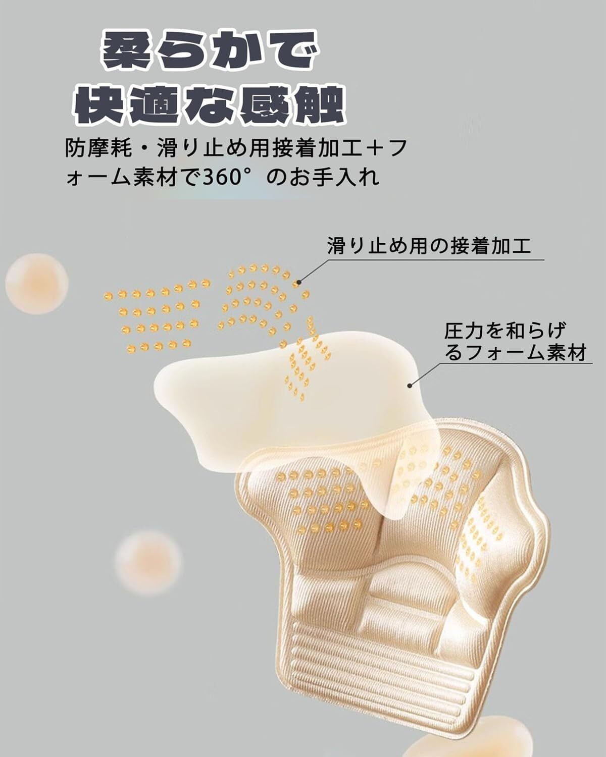 【優れたクッション性・2厚め】厚み厚さ7mm/10mm、人間工学に基づいて、ザインは両側に突き出た高弾力の記憶スポンジはかかとを優しく包み込みます。かかとへの衝撃と摩擦をしっかり吸収し、かかとの負担を軽減し疲れずらくなり、靴擦れしやすいかかとをガードます。