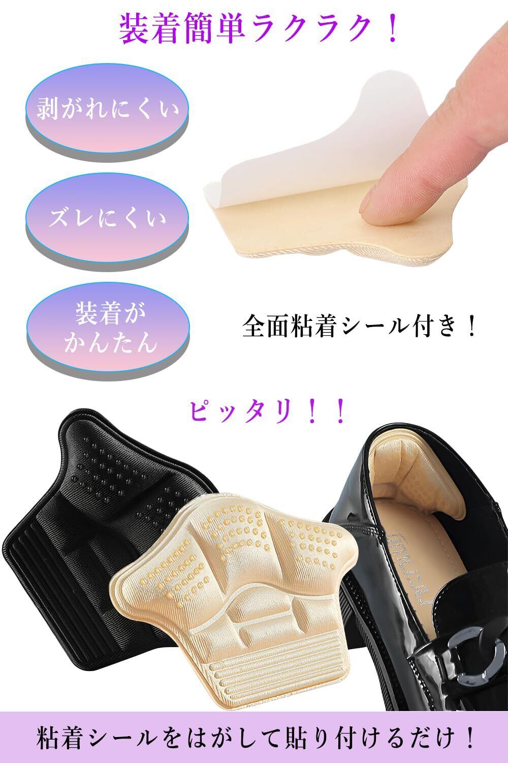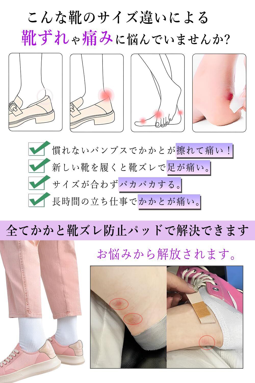 靴ずれ防止、かかと保護、サイズ調整、歩行時の衝撃緩和