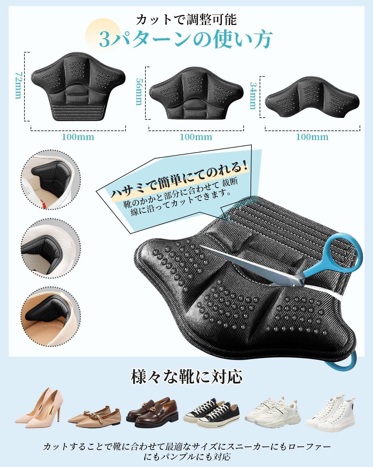 【簡単カスタマイズでどんな靴にも】かかとパッドは、靴擦れ防止だけでなく、サイズ調整も可能です。5mm厚は半サイズ大きめの靴に、9mm厚はワンサイズ大きめの靴に最適で、パカつきを防ぎながらフィット感を高めます。予め刻まれた裁断線に沿って簡単にカットでき、お客様の足型や靴の形状に合わせて調整可能。スニーカー、革靴、パンプスなど、様々な靴種にご利用いただけます