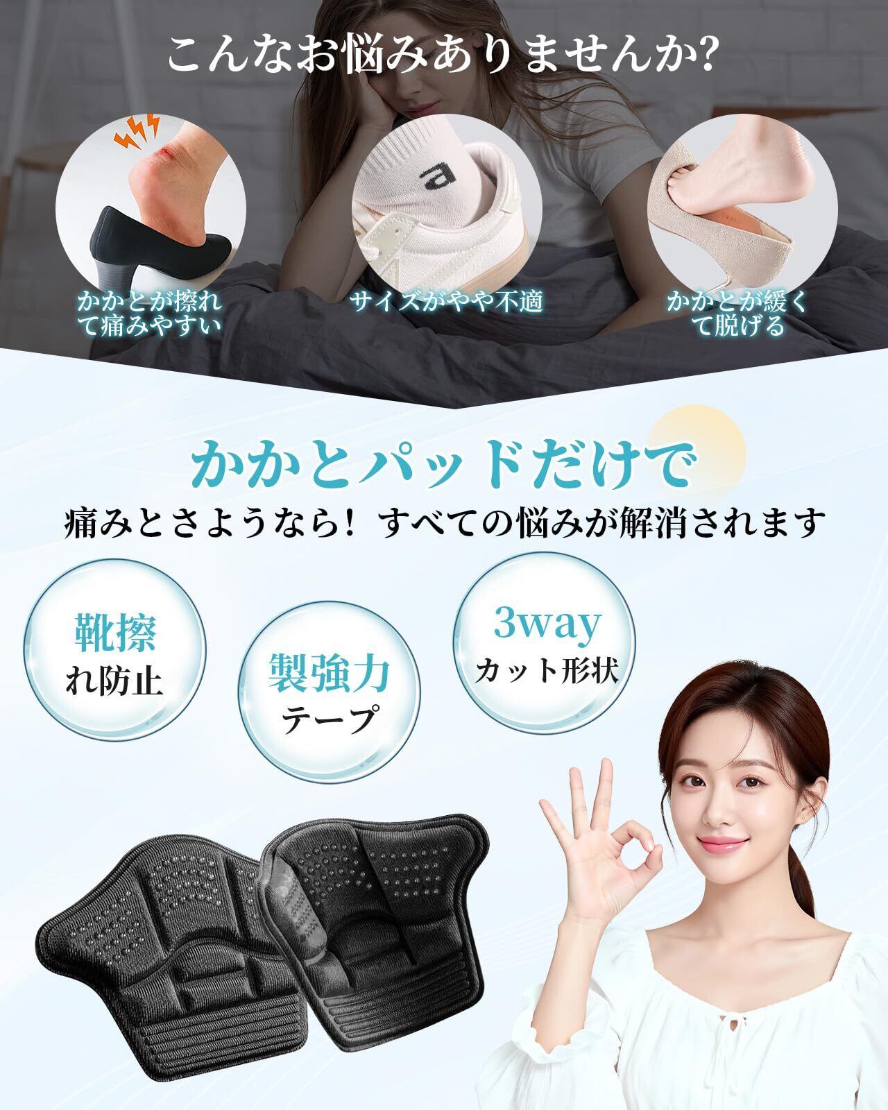【靴擦れ防止】3D立体構造が靴内のかかと空間をぴったり埋め、新鞋や革靴・ハイヒールによる「かかとずれ」の痛みを軽減。かかとをやさしく包み込み、歩行時の不要な摩擦とズレを防止。摩擦性の水疱を防ぎ、かかとをしっかりガード。靴ずれのストレスなく、快適な歩行を実現します。柔らかなクッション性で、靴擦れ防止に最適なかかとパッドです