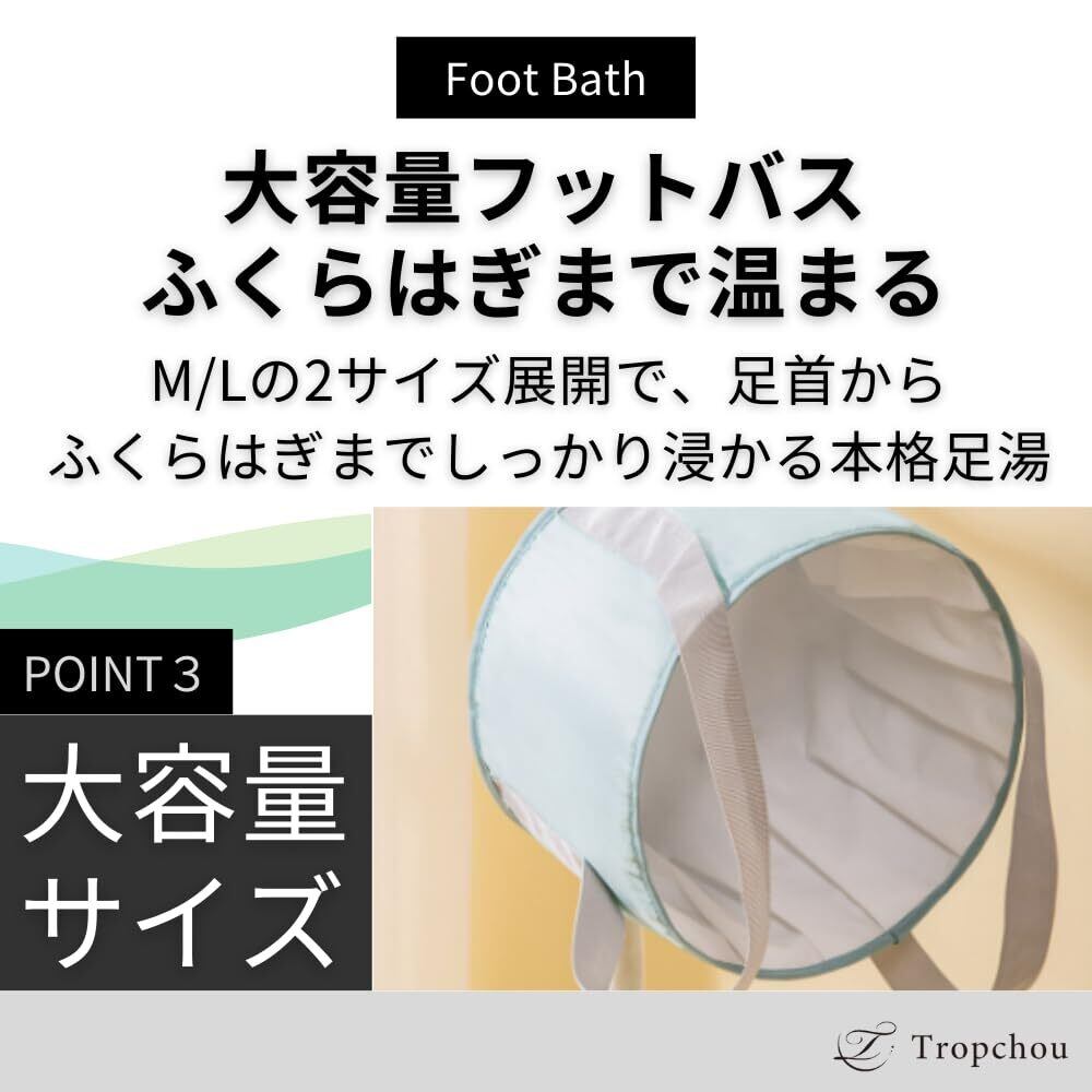 【大容量フットバス|足首~ふくらはぎまでしっかり温まる】 M/Lの2サイズ展開で、足首からふくらはぎまでしっかり浸かる本格足湯が自宅で楽しめます。 スポーツ後のアイシングバケツとしても使え、ケアやリラックスにも最適です。