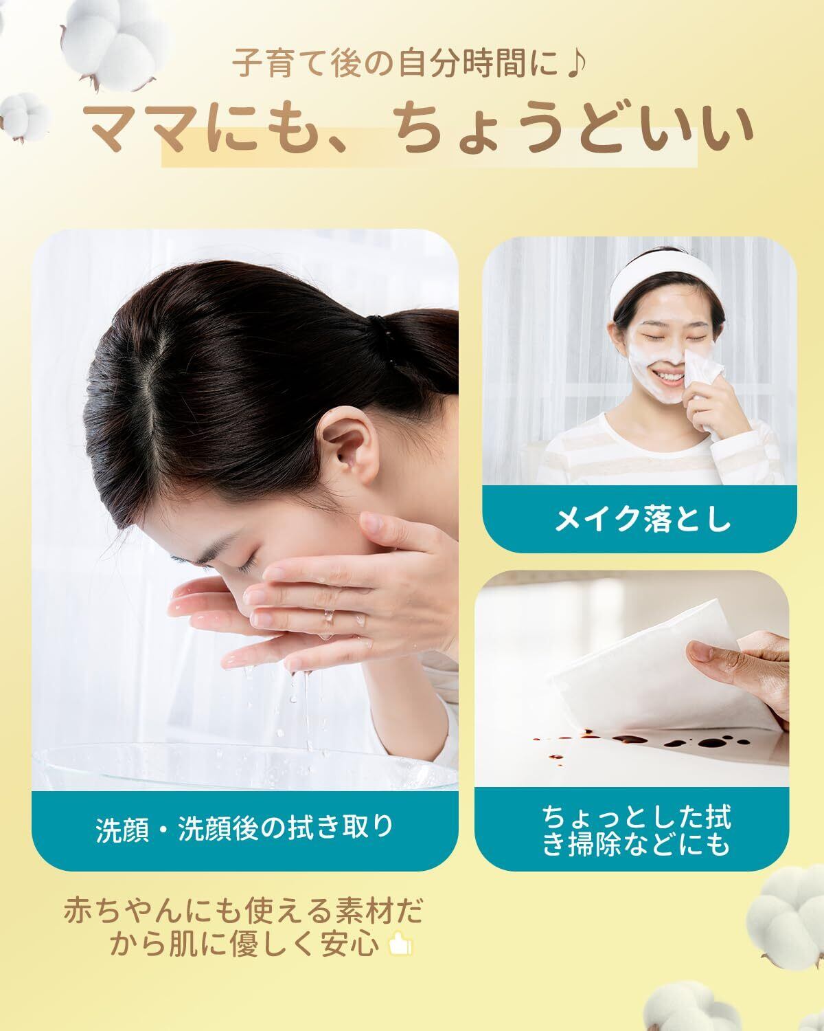 【大判サイズ&幅広く活用】Winner ベビーコットンは、15cmx20cmの大判サイズで、一枚サイズと厚さが十分し、数回拭き取れます。赤ちゃんのおしりふき、手口ふきのほか、クレンジングタオル、フェイスタオル、ウェットティッシュ、メイク落としシート、化粧コットン、お掃除などの様々なシーンにも活用できる。