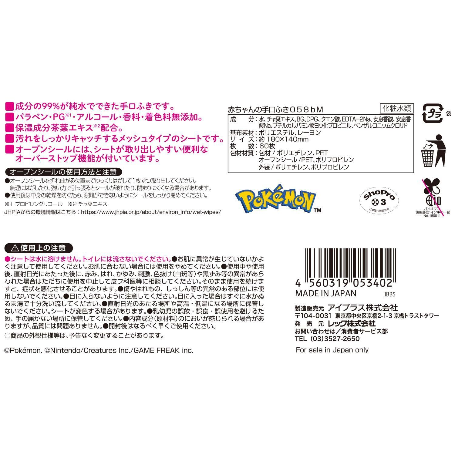 レック monpoke モンポケ 純水99% 手口ふき 60枚 × 3個 / 日本製/無添加/弱酸性/保湿成分茶葉エキス配合/ポケモン