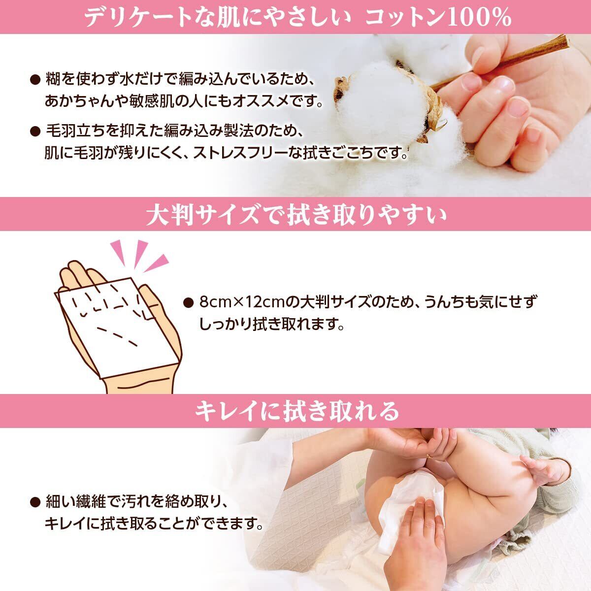 ●「エコテックス規格100」をクリアした敏感肌の赤ちゃんにもやさしい、おしりふきコットンです。●細い繊維で汚れを絡めとり、キレイに拭き取りができます。●ソフトな肌ざわりで毛羽立ちにくく、繊維残りがほとんどありません。●拭き取りやすい手のひらサイズ(8cm×12cm)で、2ツ折にしても十分な大きさです。●80枚入はチャック付きで清潔に保管でき、携帯にも便利です。