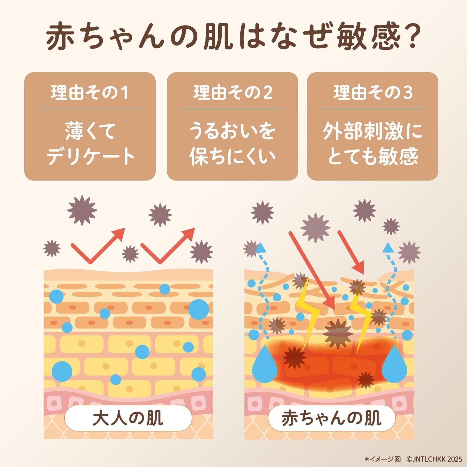 【生後1日目から使える低刺激設計】 赤ちゃんの肌は大人より薄く、バリア機能が未発達。本製品は80年*以上の皮膚科学研究に基づき開発され、生後1日目から使える敏感肌が当然の赤ちゃんのための処方。なめらかに伸びてすぐになじみ、ベタつかない使い心地です。 (*研究期間は分割前の旧グループ会社における研究実績を含む)