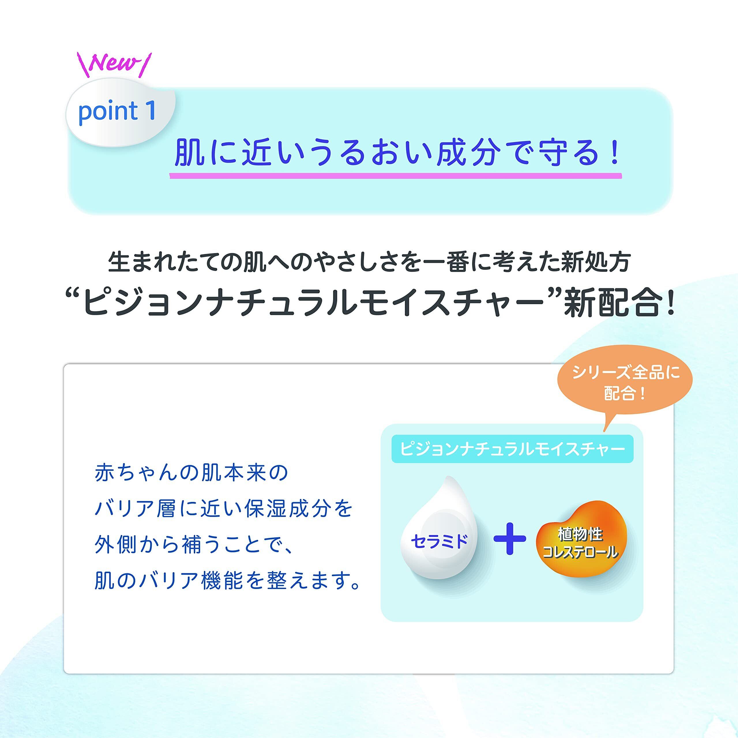 赤ちゃんのお肌へのやさしさをいちばんに考えたスキンケア 未熟な赤ちゃんの肌に不足しがちな、お肌本来のうるおい類似成分「ピジョンナチュラルモイスチャー※」配合したベビークリアローションです。 ※セラミドNP+イソステアリン酸フィトステリル <ベビークリアローション 120ml (ベーシック)の特長> ●とろみがつき、使いやすさアップ! (当社従来品比) ●水分たっぷりのさっぱりした使い心地 ●赤ちゃんのお肌に近い弱酸性 ●皮フ科医による皮フ刺激性テスト済み (すべての方に肌トラブルが起きないというわけではありません) ●肌にやさしい無添加シンプル処方
