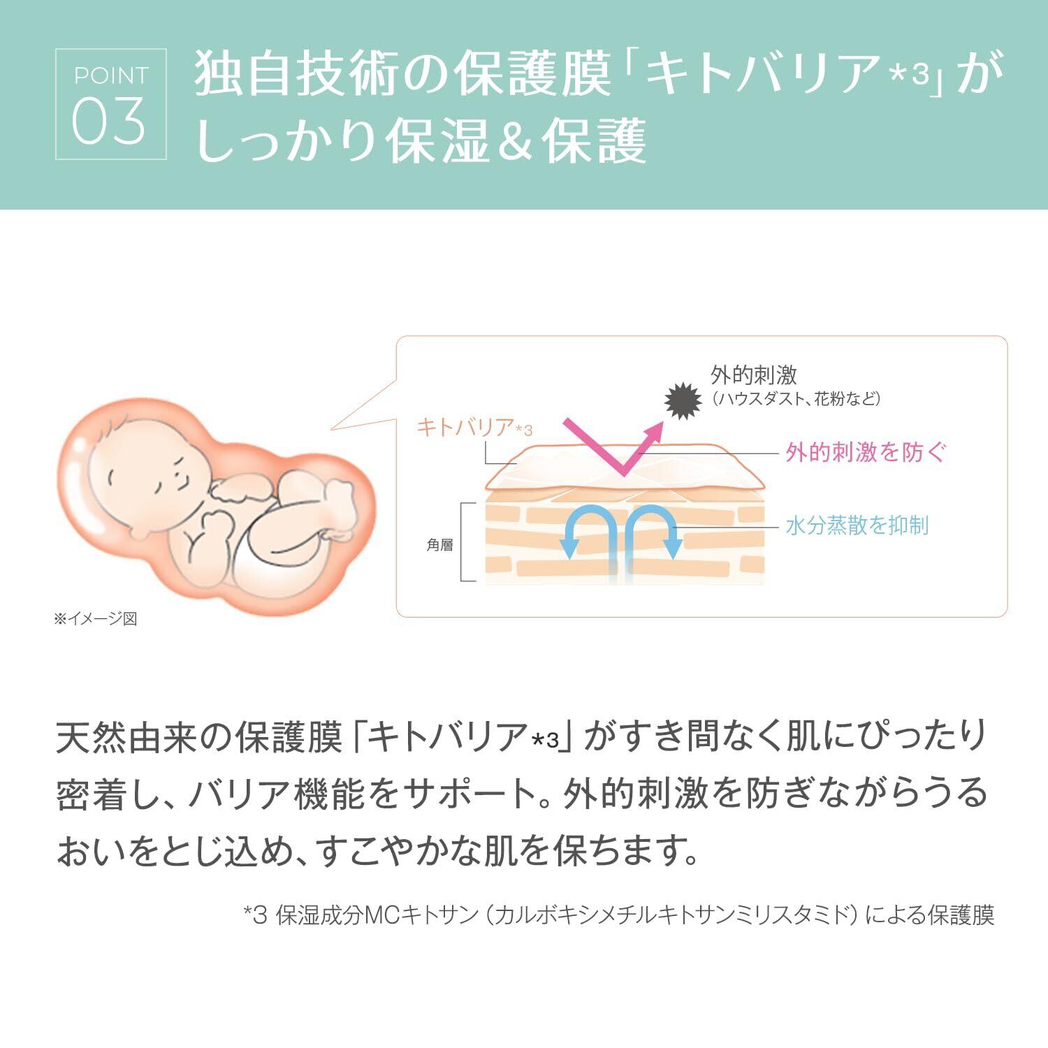 【外的刺激を防いで肌の潤いを守る】天然由来の保護膜<キトバリア*1>を肌表面につくり、外的刺激を防ぎながら肌内部*2のうるおいを守ります。*1 保湿成分MC キトサン(カルボキシメチルキトサンミリスタミド)による保護膜 *2 角層
