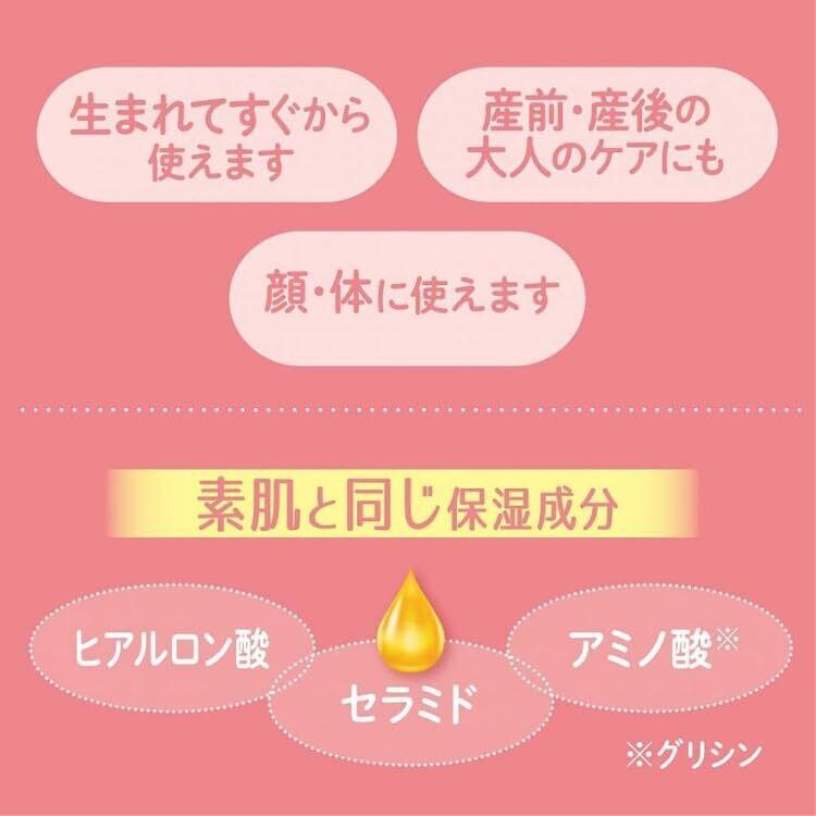 ●赤ちゃんのお口や目に入る「お悩みレス処方」スキンケア。 ●食品成分90%&目にやさしい(しみにくい)低刺激処方で、親子のスキンケア時間をトラブルレスに。 ●赤ちゃんのお肌の汗や汚れをやさしく洗い流します。 【成分】 水、ソルビトール、グリセリン、PEG-400、トレハロース、ヒアルロン酸Na、セラミドNG、グリシン、シロキクラゲ多糖体、BG、ココイルグルタミン酸Na、ココアンホ酢酸Na、ラウリルヒドロキシスルタイン、PEG-60水添ヒマシ油、クエン酸、フェノキシエタノール、メチルパラベン 【安全警告】 ●お肌に異常が生じていないかよく注意してご使用ください。●お肌に合わない時、使用中又は使用後、日光にあたって赤み、はれ、かゆみ、刺激、色抜け(白斑等)や黒ずみ等の異常が出た時は使用を中止し、皮ふ科専門医等へご相談ください。そのまま使用を続けますと症状を悪化させることがあります。●傷、はれもの、湿疹等異常のある時は使用しないでください。●本品は目にやさしい処方となっておりますが、目に入った時はすぐに水又はぬるま湯で洗い流してください。●大量に飲み込んだ時は、水を飲ませる等の処置を行った後、医師にご相談ください。●本品は食品成分を使用しておりますが、食べ物ではありません。●乳幼児の手の届かないところに保管してください。●高温又は低温になる場所や直射日光のあたる場所に置かないでください。●この商品は食品成分を配合しているため、原料特有のにおいが感じられることがありますが、品質には問題ありません。