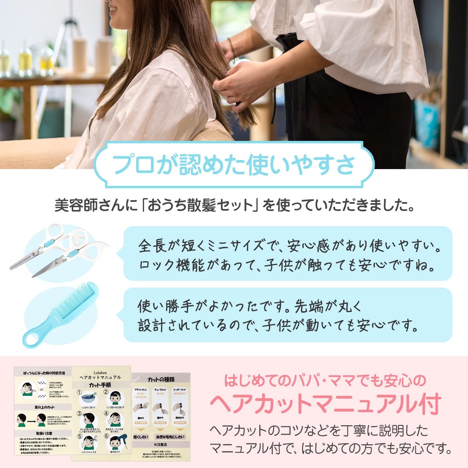 【ヘアカットマニュアル付】はじめてヘアカットするパパ、ママでも安心のマニュアル付。お子さまのヘアカットのコツなどを丁寧に説明しています。