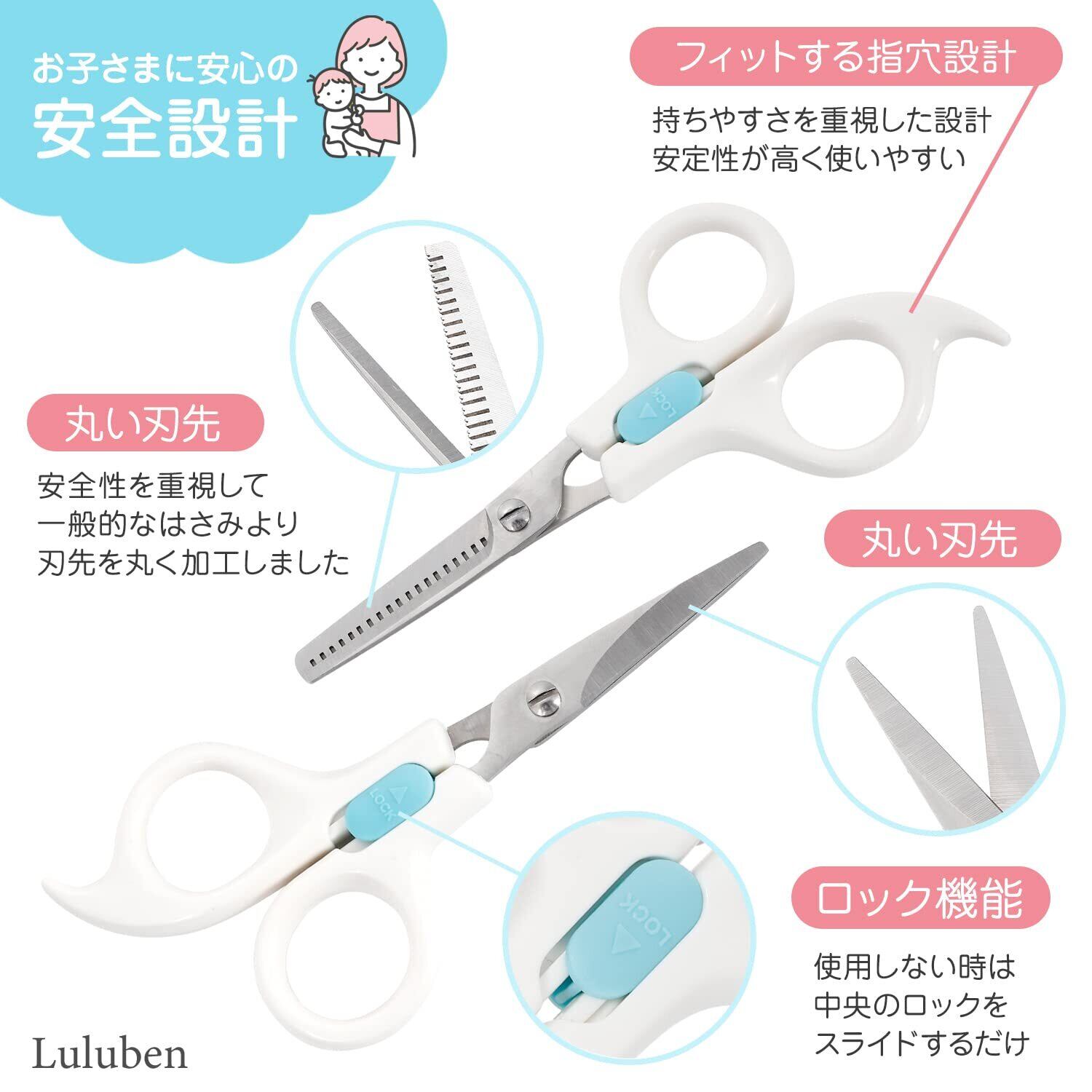 【安全性重視】ハサミ、すきばさみともに、安全性を重視しました。中央のブルーの部分でロックできるので、使用しないときでも安心。はさみの先端は、一般的なはさみより丸く加工されているので安全です。くしも安全性を重視して、全体的に丸く加工しました。くしの先端は球体で、頭皮をキズつけない設計。