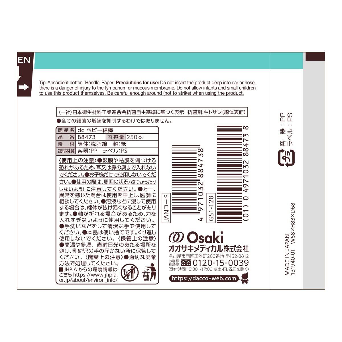 dacco(ダッコ) ベビー綿棒 250本入 日本製 コットン100% 天然抗菌成分加工 88473