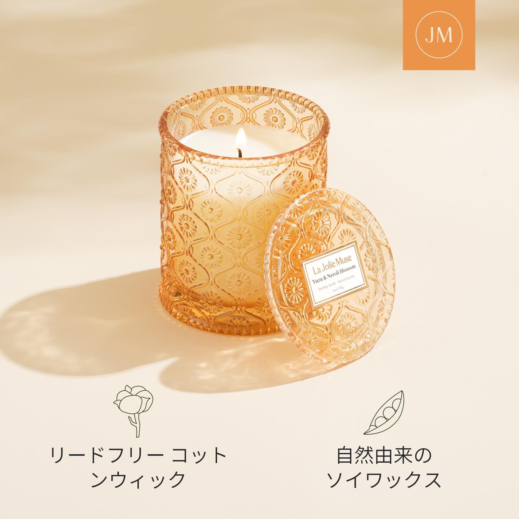 LA JOLIE MUSE アロマキャンドル 柚&ネロリブロッサム キャンドル ホームフレグランス ナチュラルソイワックス 女性向けギフト 170g 燃焼時間40時間