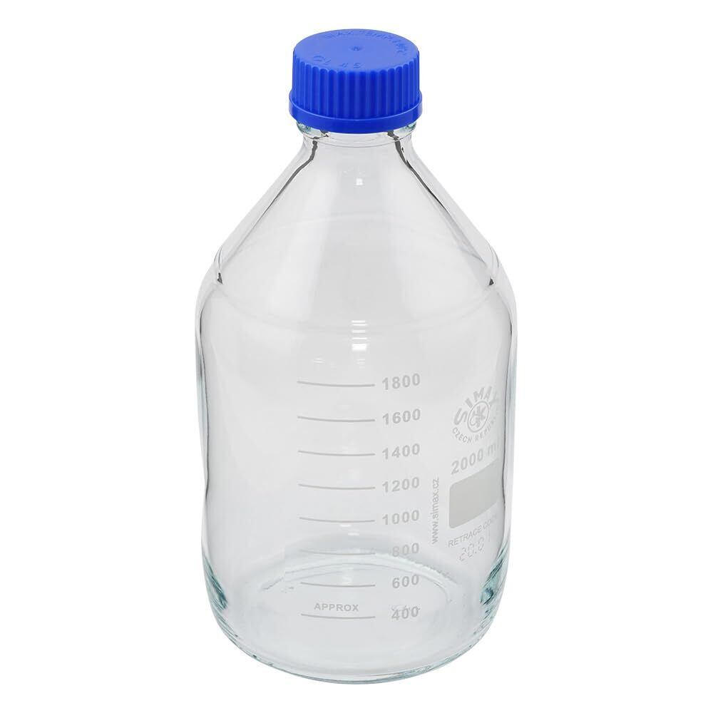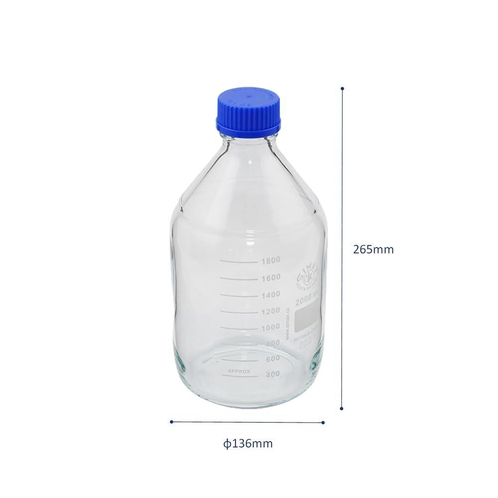 <br>●容量(mL):2000<br>●外径×高さ(mm):φ136×265<br>●材質:本体/硼珪酸ガラス、キャップ/PP(ポリプロピレン)<br>●ネジ口規格:GL-45 <br>●オートクレーブ可<br>●※オートクレーブ滅菌にかける際はキャップを外すか、または1回転以上緩めてから行ってください。