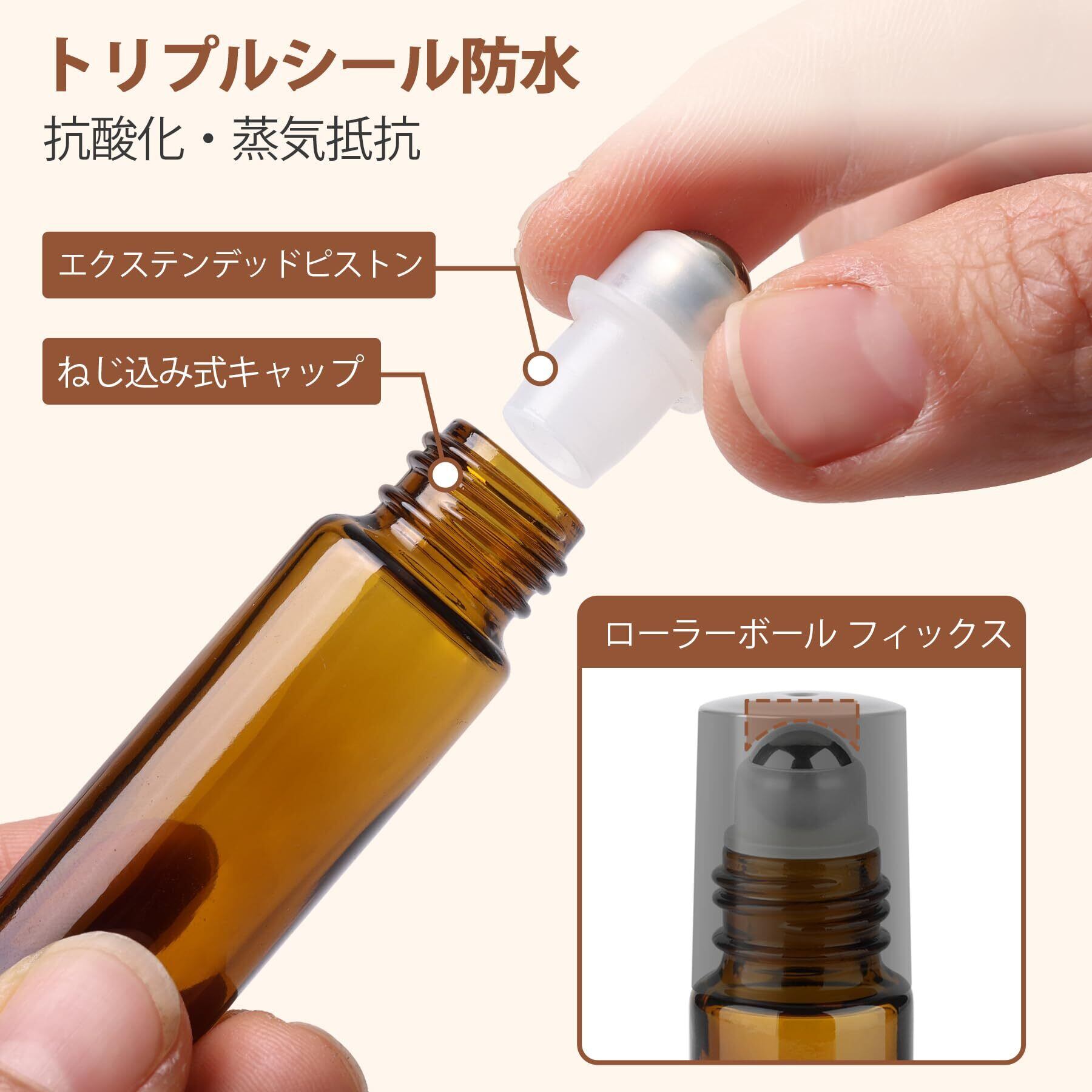 【遮光のロールオンボトル】厚みがあり、ビスフェノールAと鉛がない上質なガラスで作られています。CommSafのアロマ保存容器は滑らかで、耐食性に優れています。茶色の本体は、紫外線からエッセンシャルオイルを守ります。