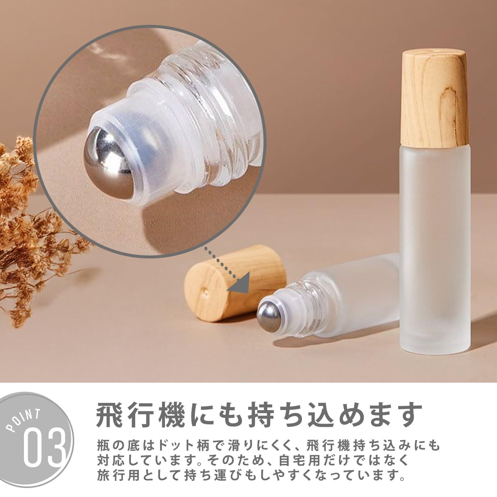 【木の蓋が可愛いアロマボトル】木目調のふたが可愛い持ち運び用のロールオンボトル10本セットです。持ち運びに便利なサイズで、キャンピング、出張や旅行などの際に携帯して頂けます。旅行の際のポケットやバッグ、化粧袋に簡単に入れることができます。