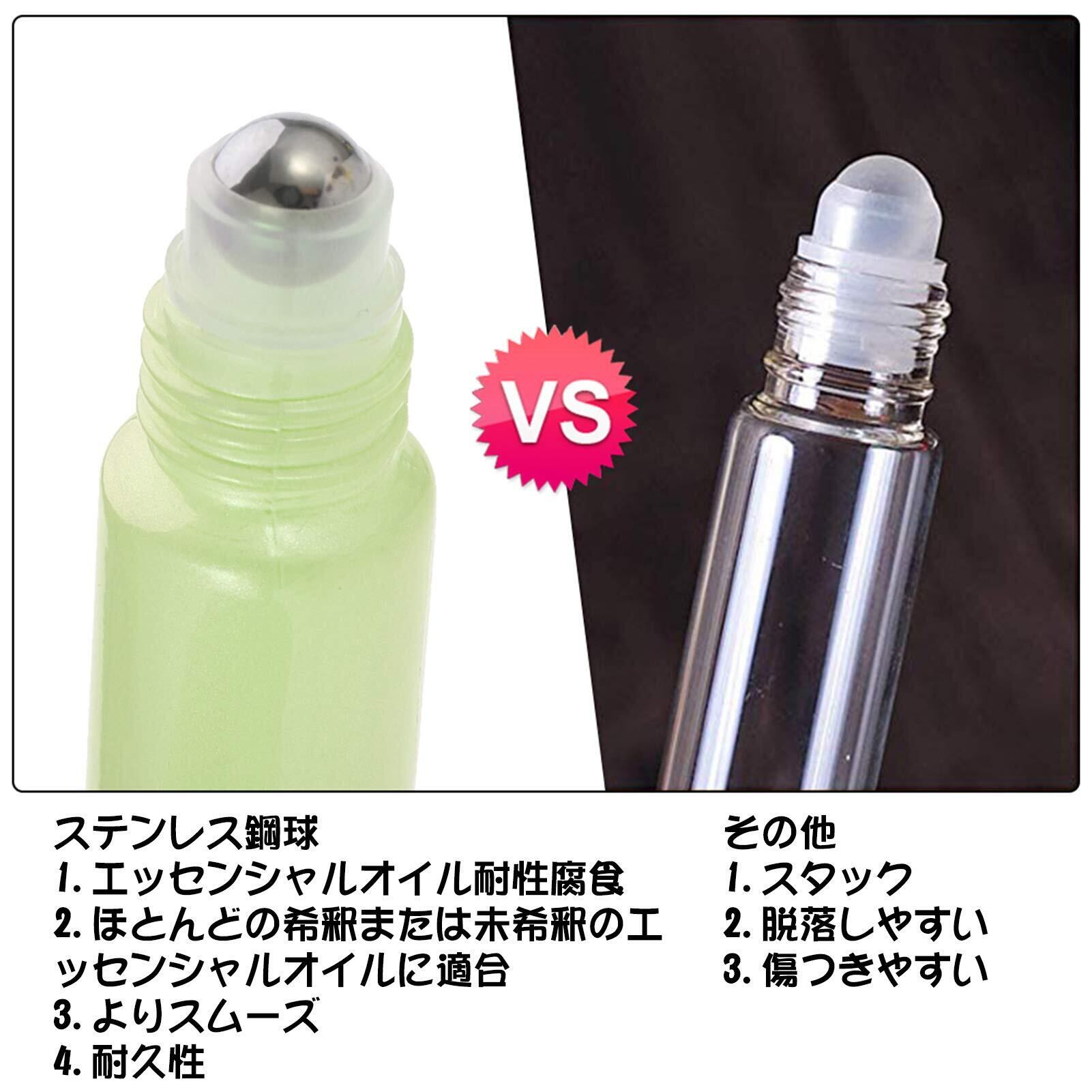 【便利性】手作り香水などの容器として人気のロールオンタイプですので、香水類を飛び散らせません。先端がスチールボールになっていて、コロコロとまわり、手を汚さずご使用いただけます。ボトルの色が違って、小分けしたオイルや手作り化粧水などを保存し、使用に超便利です。