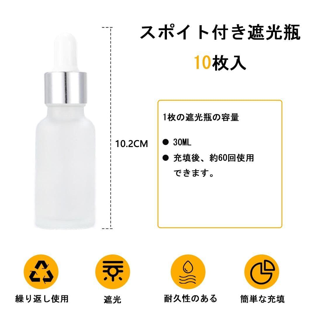 【安全小分けボトル】スポイト瓶10本、容量:30ml、素材:ガラス、ゴム、PP(ポリプロピレン)。香水、エッセンシャルオイル、マッサージオイル、アルコールなどの液体を保存でき、日常使いに便利です。