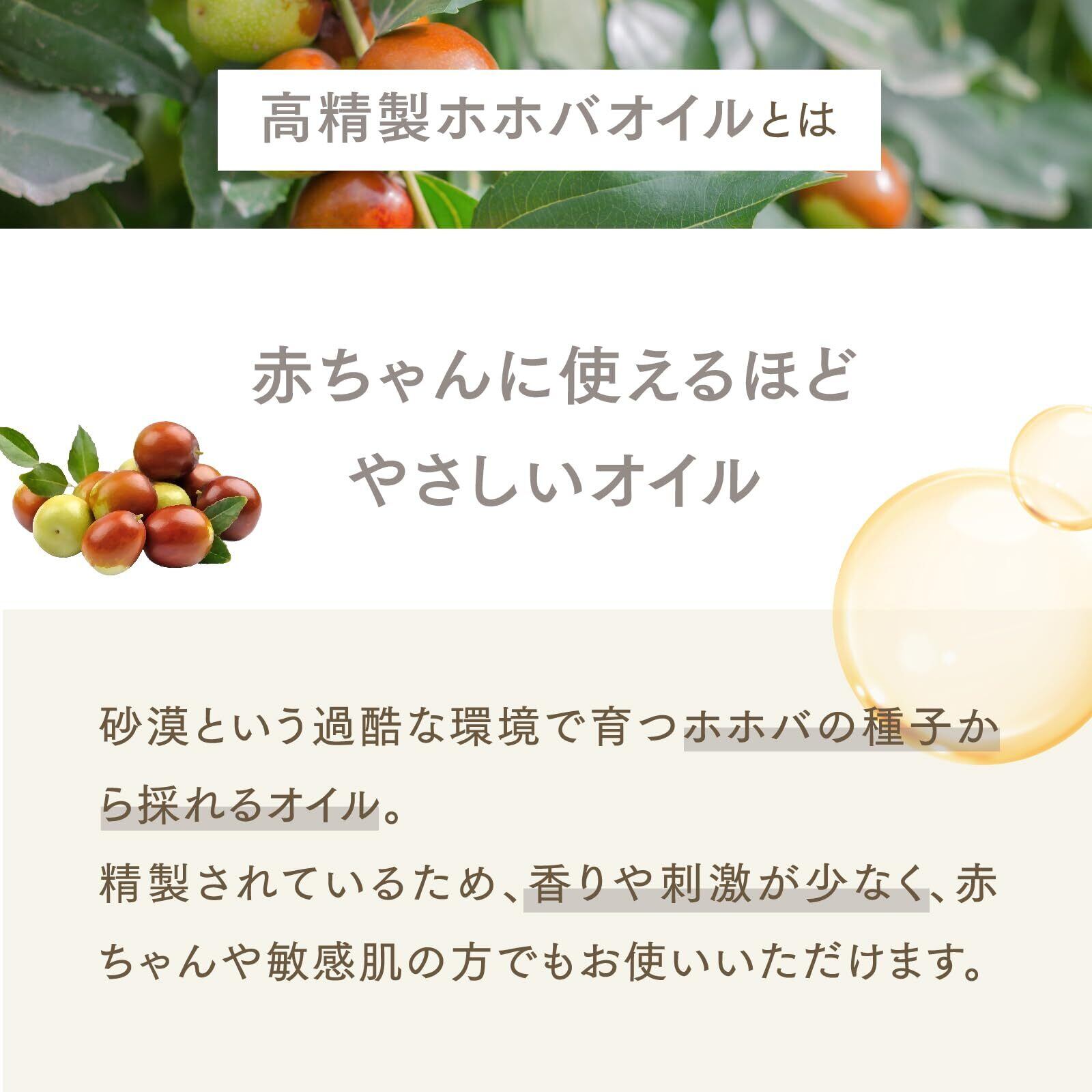 【高精製ホホバオイルとは】高精製ホホバオイルは、砂漠という過酷な環境で育つホホバの種子から採れるオイルです。精製されているため、香りや刺激が少なく敏感肌の方でもお使いいただけます。またカラーレスなので着色のリスクが少ないため、着衣でのご使用にもおすすめです。