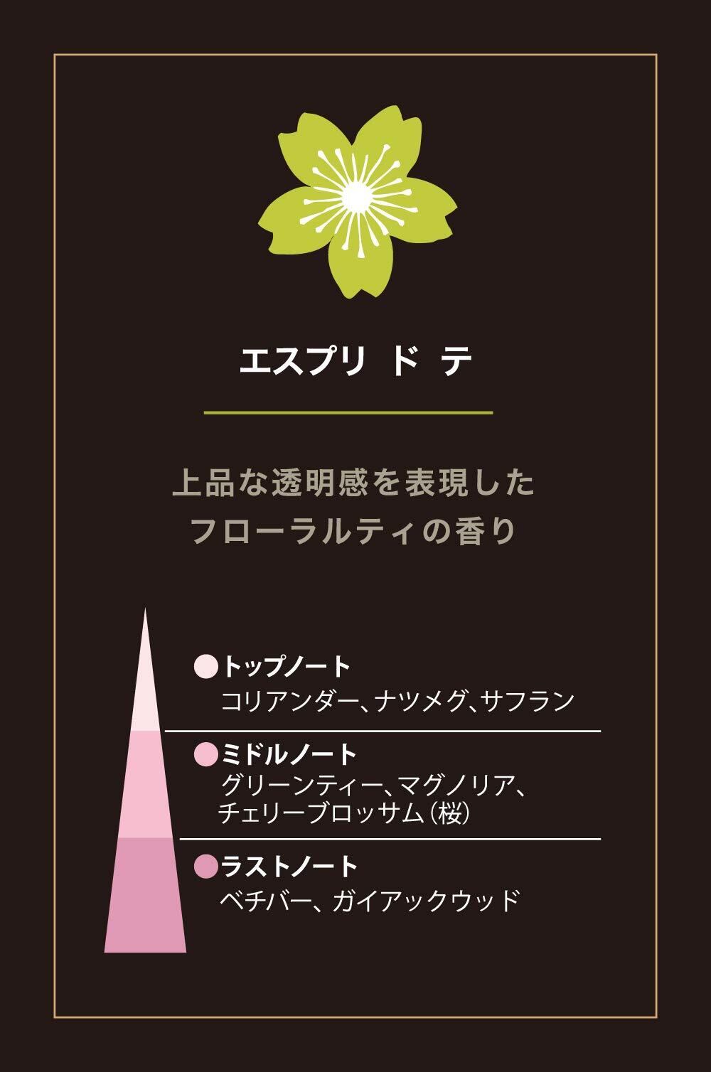 茶の香りの透明な調和、そして茶室という精神の高みと永遠へと誘われるような香り。気品という美が色と香りとなってあたりを覆う。フレグランスリフィル250mlです。