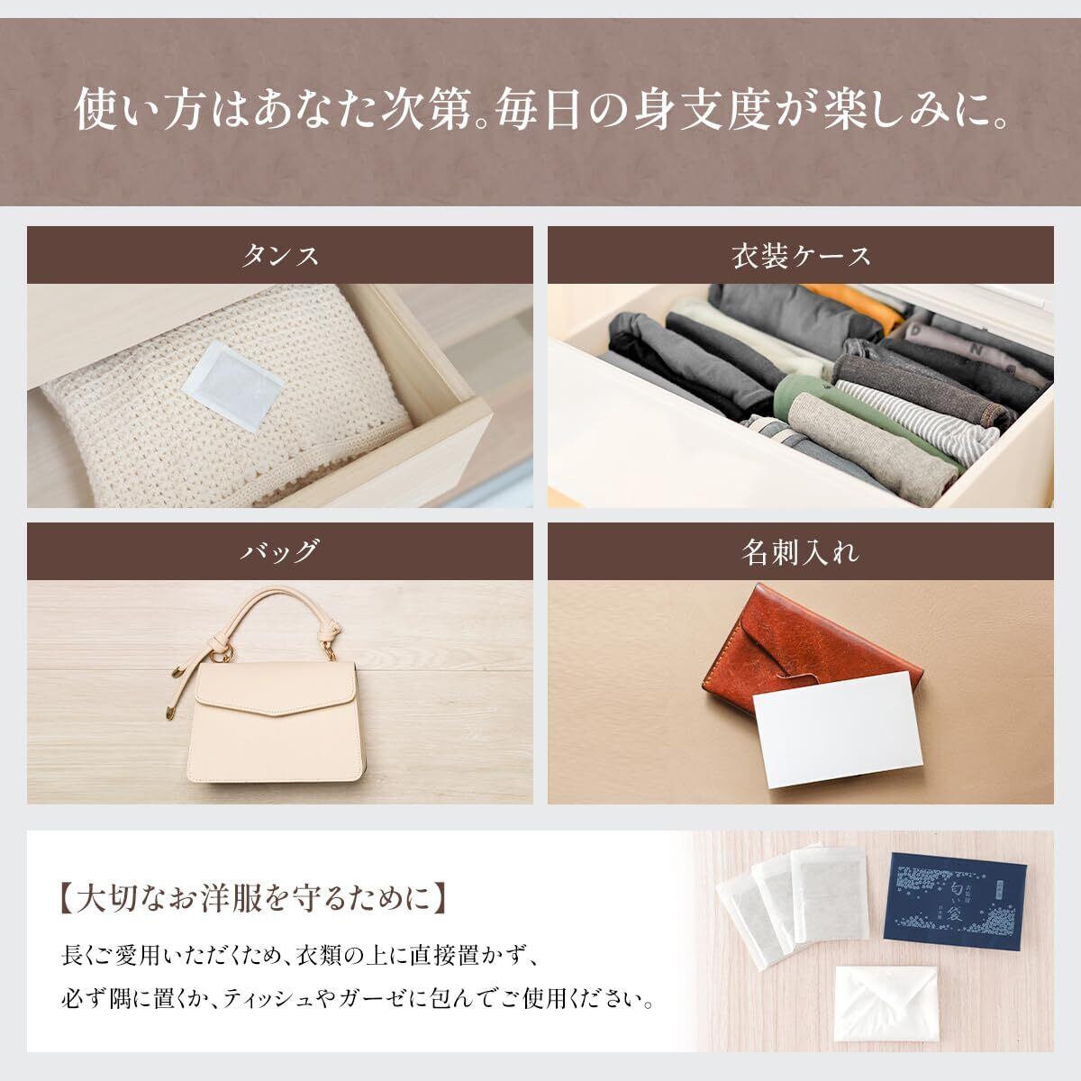 タンスなどに入れて衣装に和の香りをほのかに纏わせます。